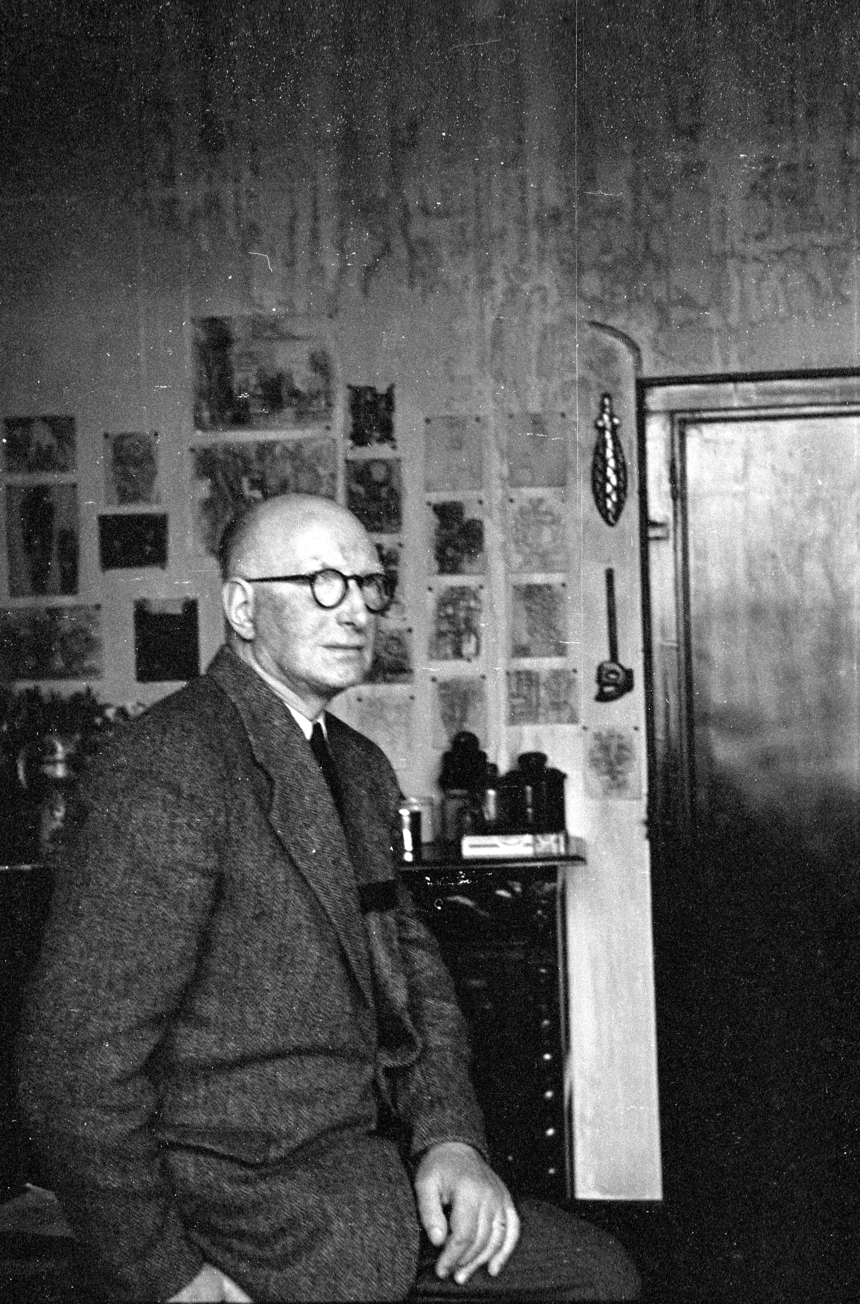 Black and white photograph of a bald white man in a tweed blazer and dark tie, seated in a room with small artworks pinned to the wall behind him