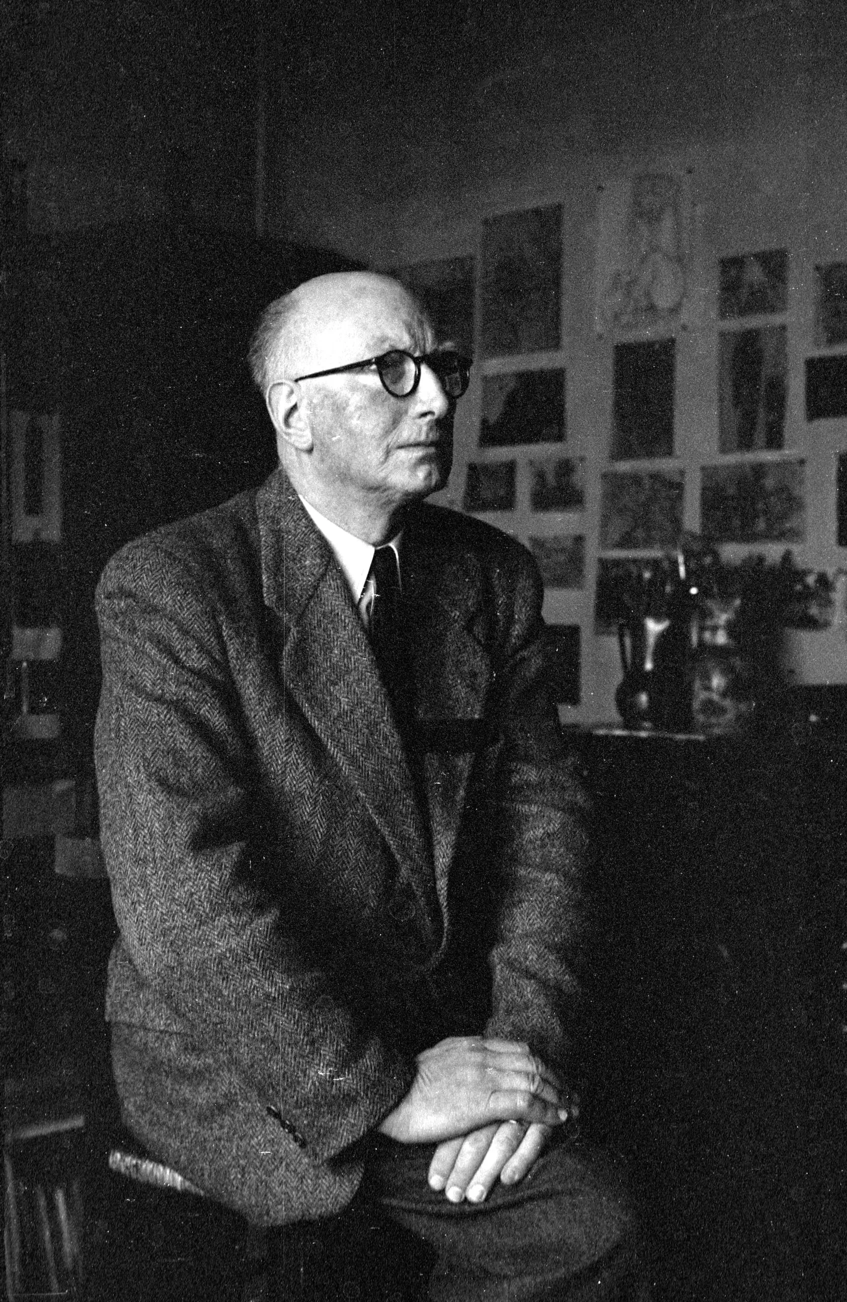 Black and white photograph, older bald man in dark tweed suit seated with hands folded, turned slightly left, studio wall with pinned drawings visible behind him