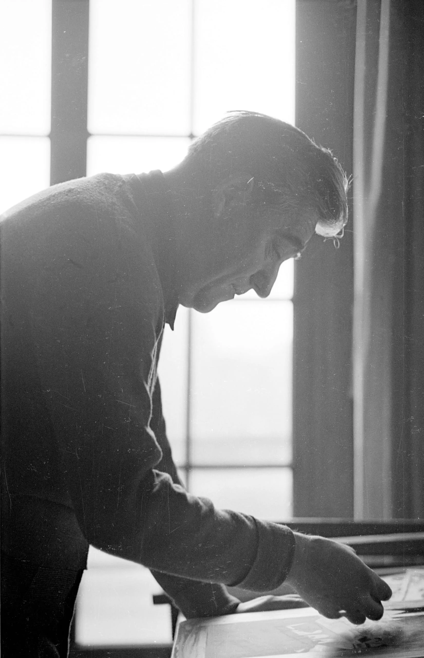 Black and white photograph of a man in profile, leaning over a work surface, backlit by a large industrial window