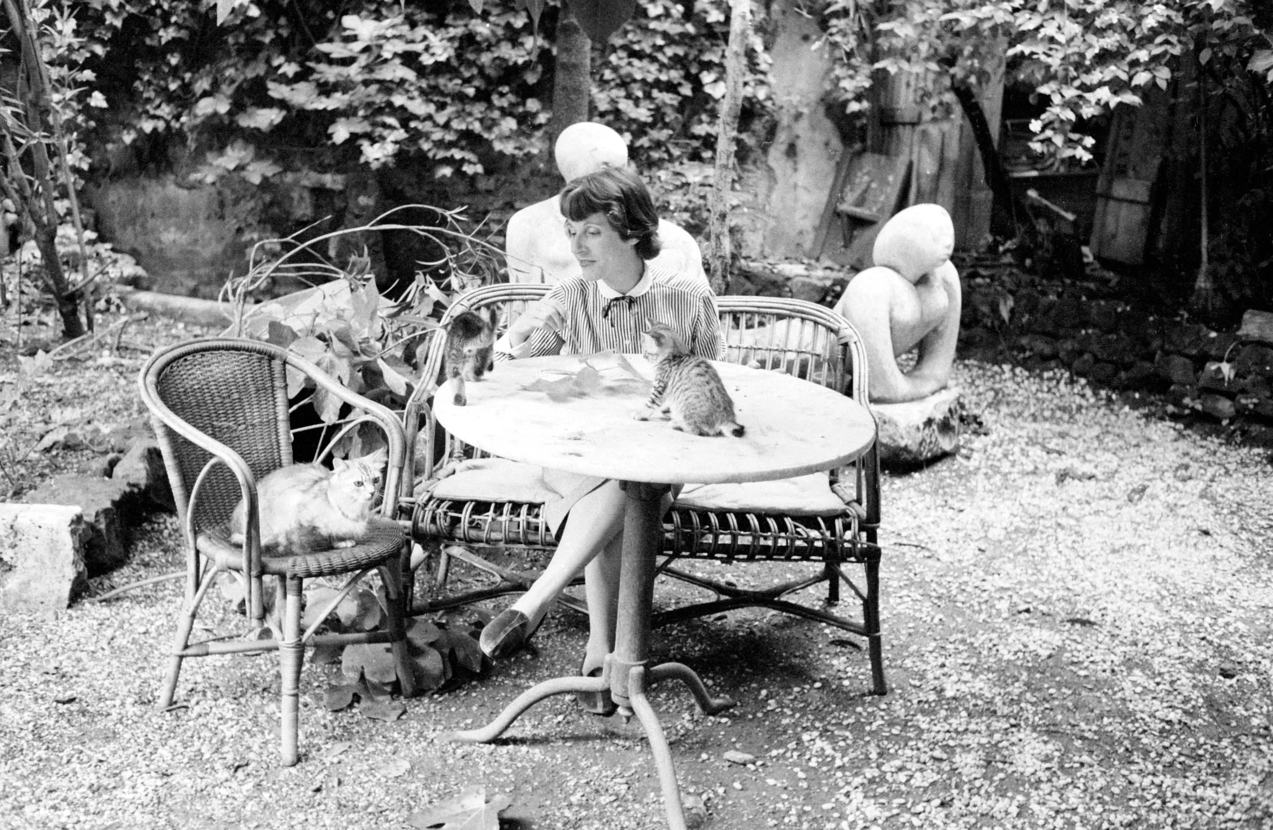 Black and white photograph of a woman in a striped shirt seated at a round outdoor table with three cats in a garden with stone sculpture
