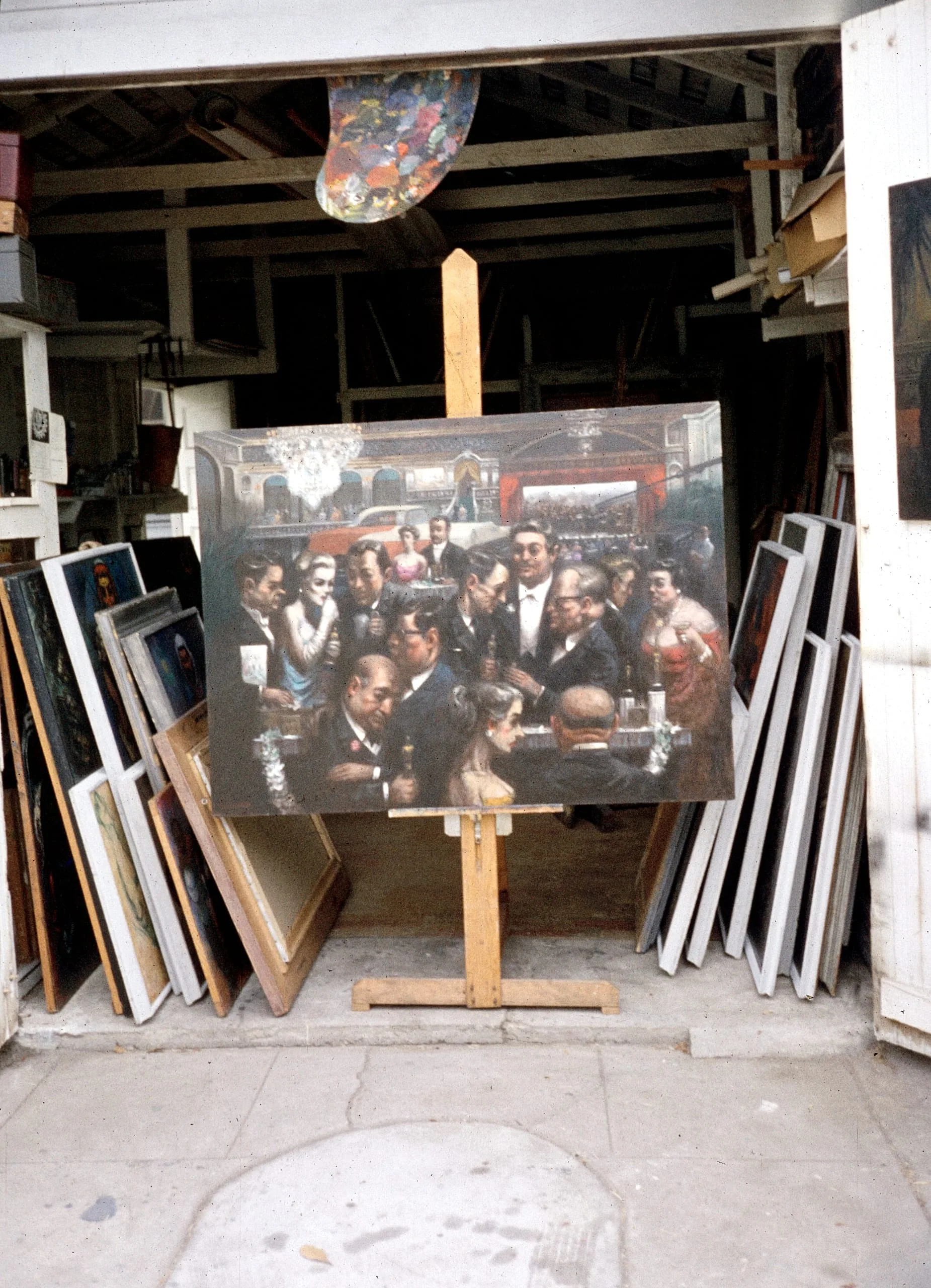 Color photograph of a large figurative oil painting on a wooden easel in an artist's studio, surrounded by stacked canvases; the painting depicts a crowded nightclub interior with figures in dark suits around a table