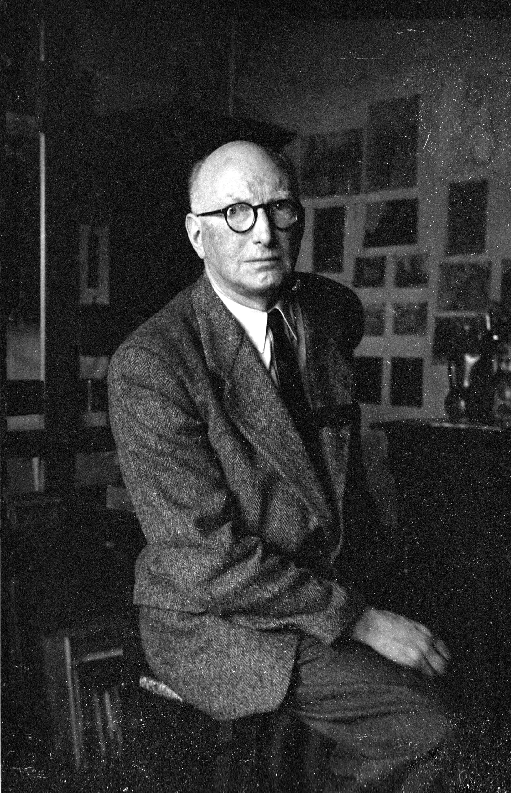 Black and white photograph, a bald white man in round glasses and a tweed jacket seated facing the camera, with framed works on a wall behind him