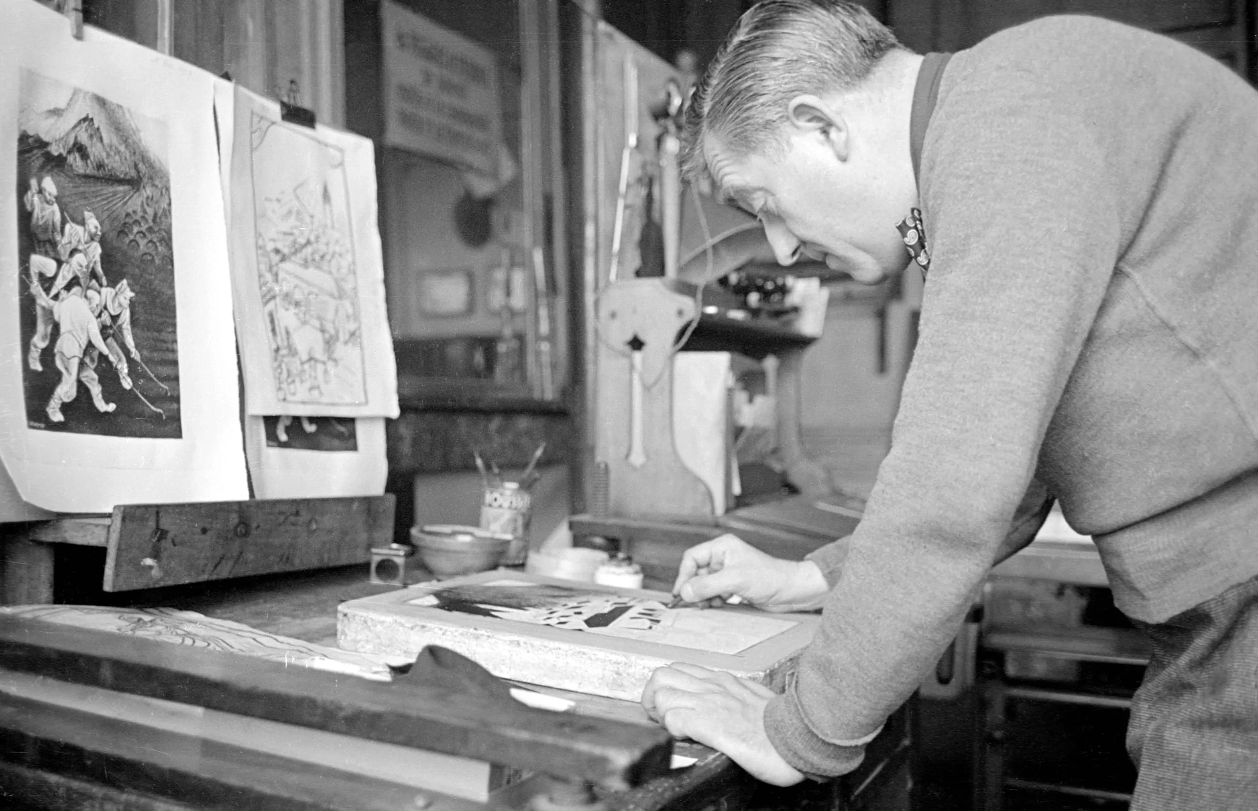 Black and white photograph of a man in a sweatshirt leaning over a worktable, carving a block, with two finished prints propped nearby in a printmaking studio