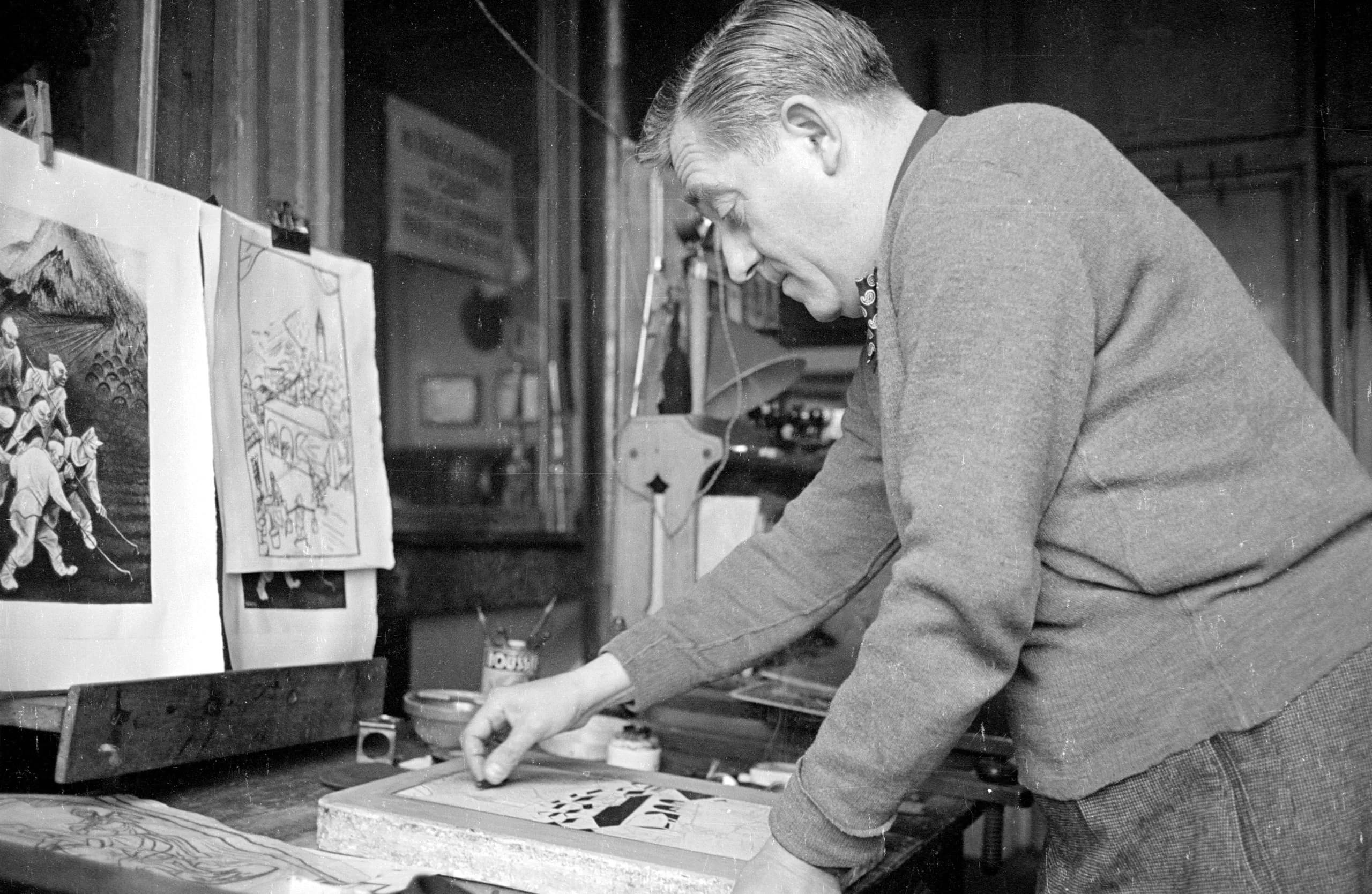 Black and white photograph of a man in a sweater leaning over a worktable, working on a printing block, with large detailed prints pinned to a board at left