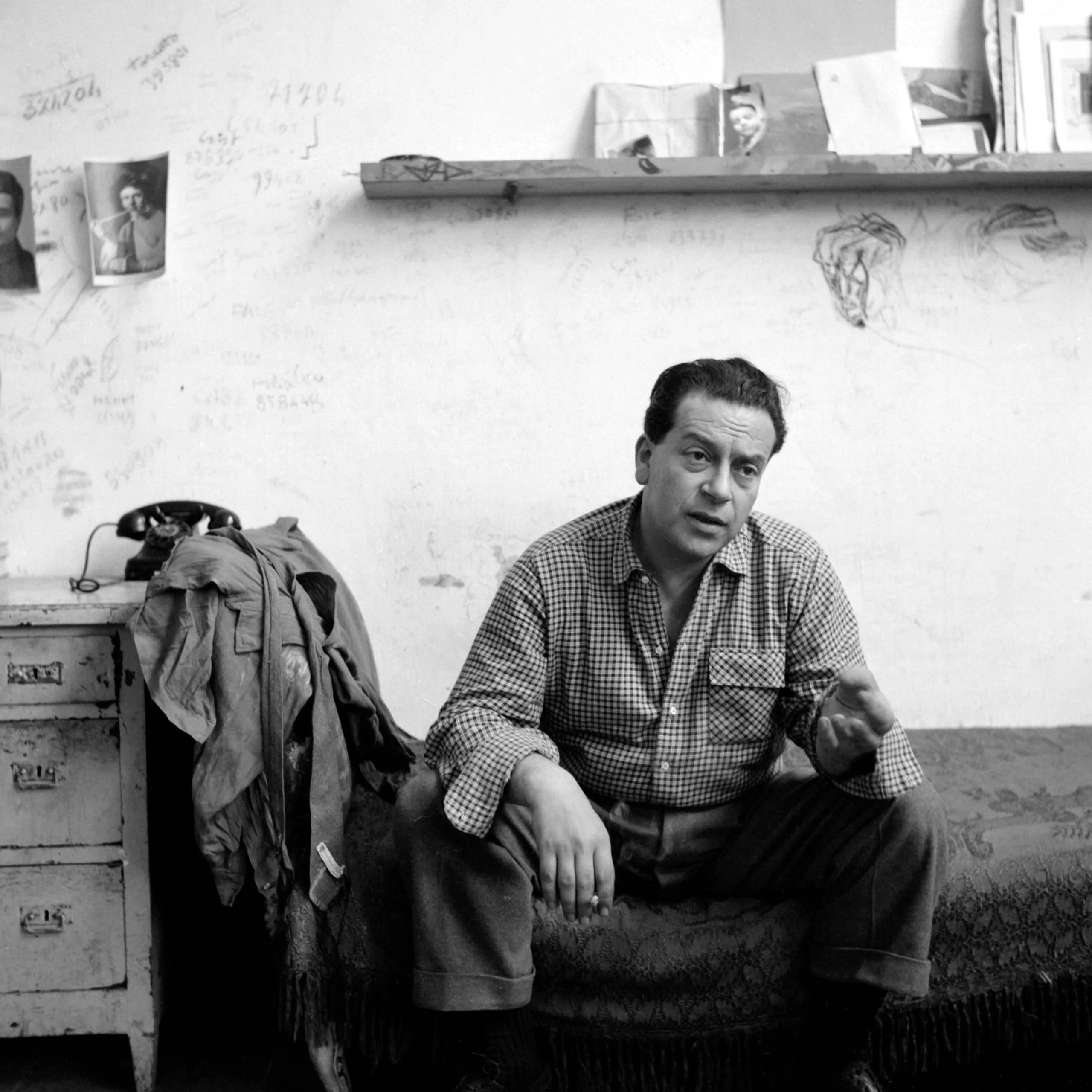 Black and white photograph of a middle-aged man seated on a fringed stool in a cluttered studio, wearing a checked shirt, lips parted, hand raised holding a cigarette