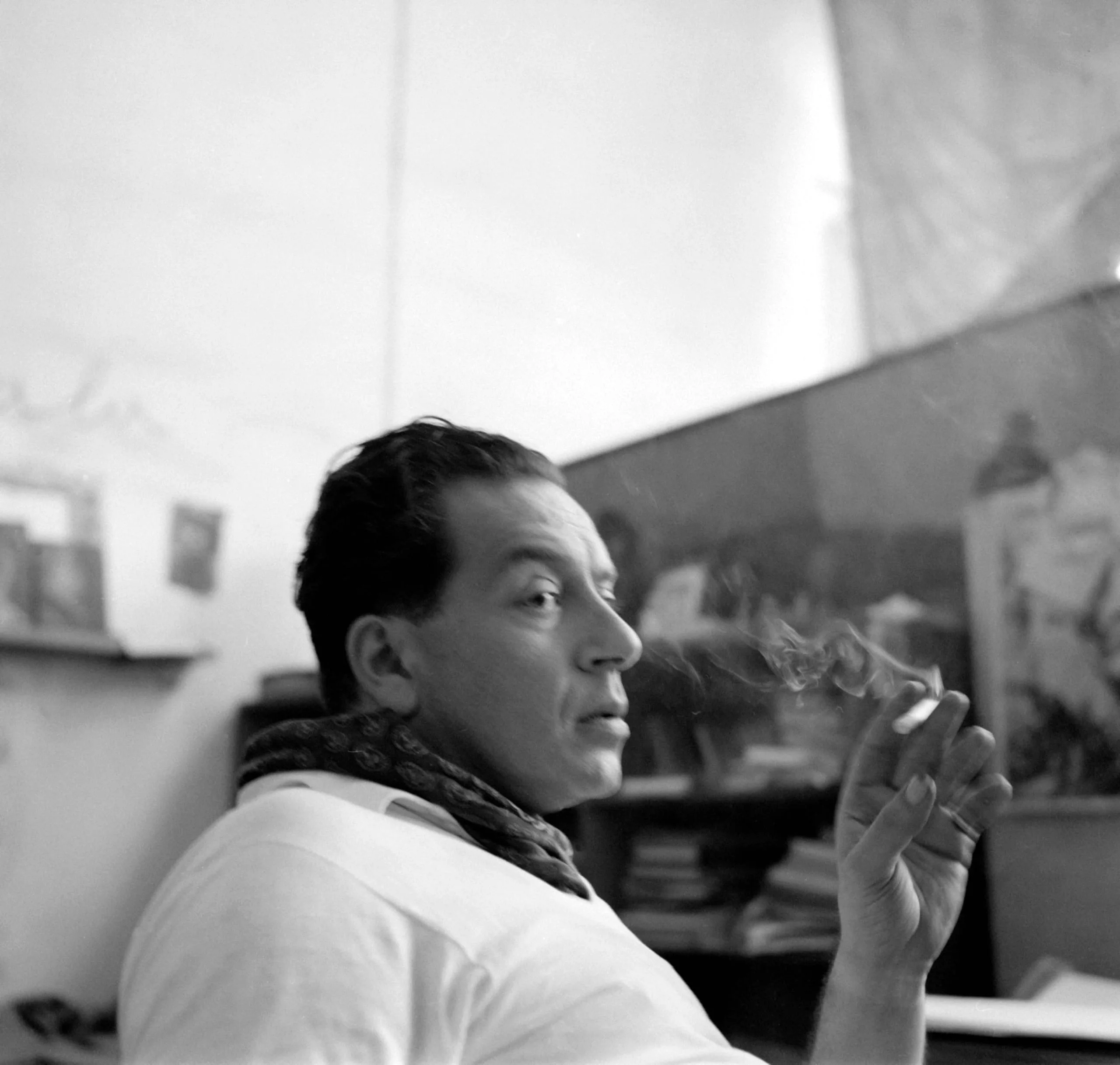 Black and white photograph, man in profile holding a lit cigarette, wearing a white shirt and patterned scarf, with canvases and shelves visible behind him
