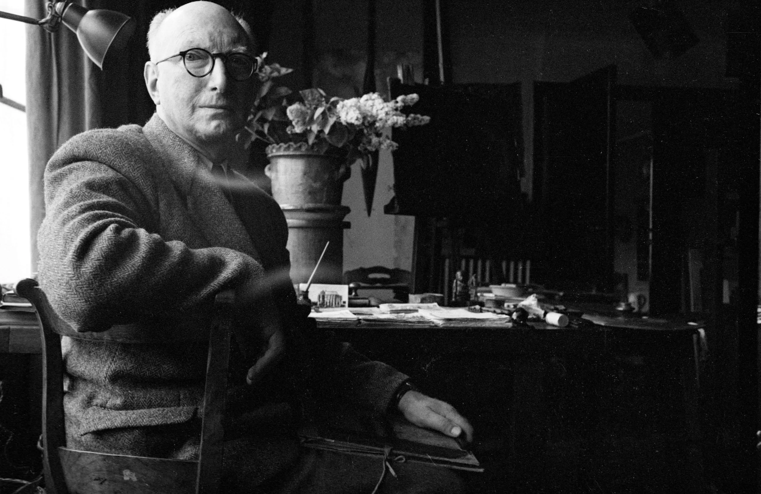 Black and white photograph, older white man in round glasses and a crewneck sweater seated at a cluttered worktable, lit from the left by a nearby window