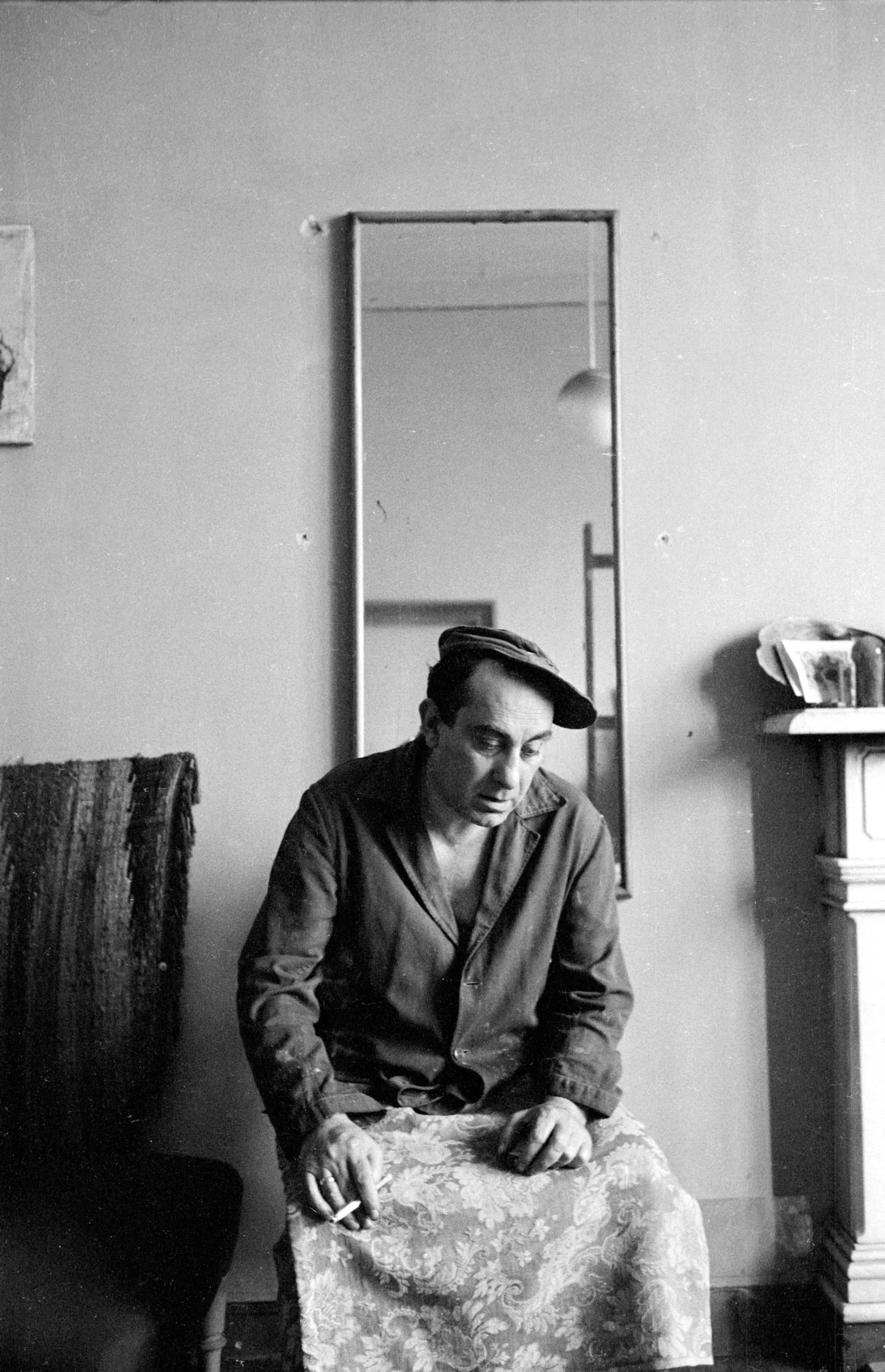 Black and white photograph of a man in a flat cap and work jacket, seated and looking downward, holding a cigarette, with a mirror and fireplace mantel behind him