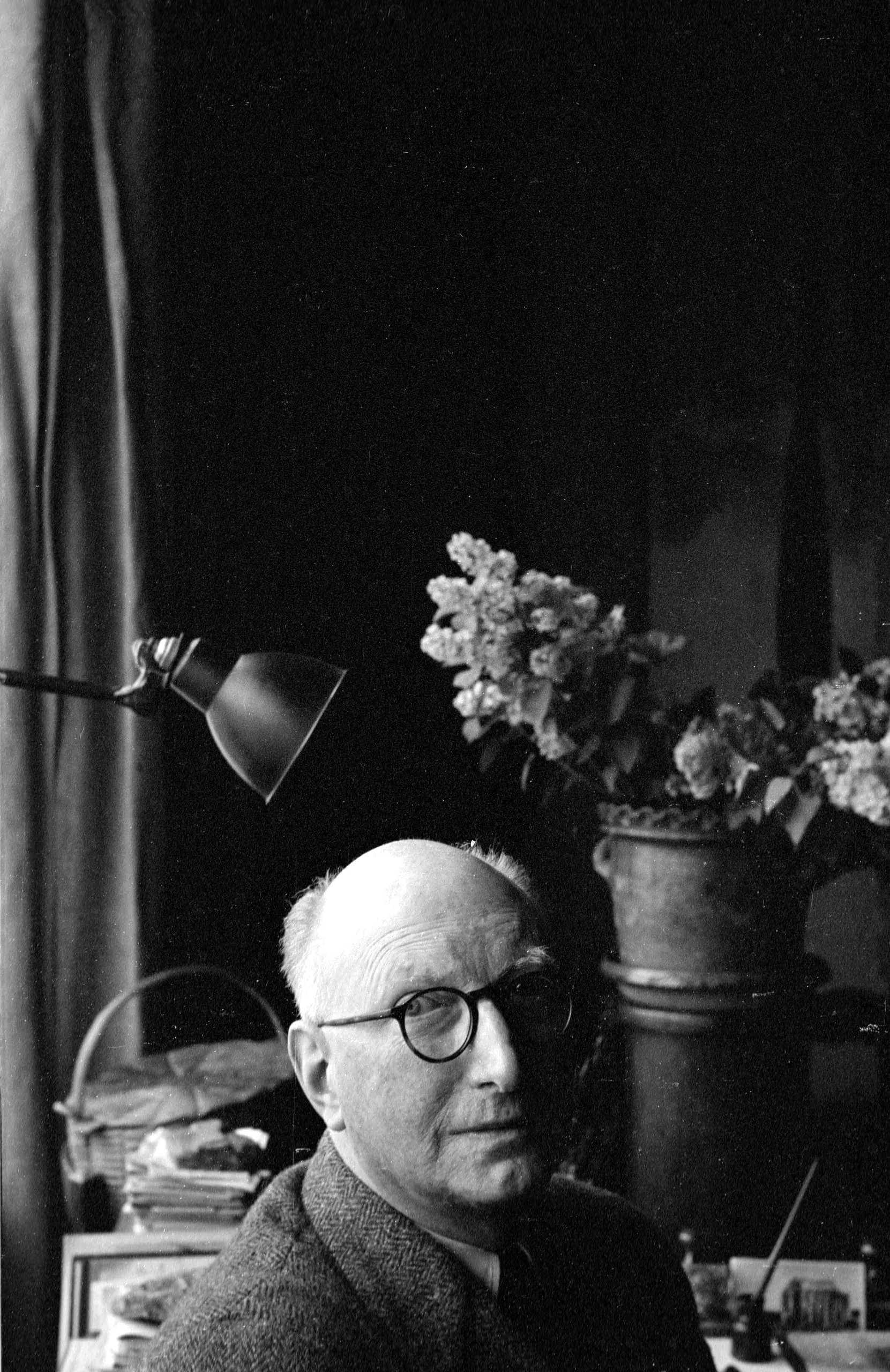 Black and white photograph, head and chest portrait of a bald, bespectacled white man, softly lit, seated before a desk lamp and flowering potted plant