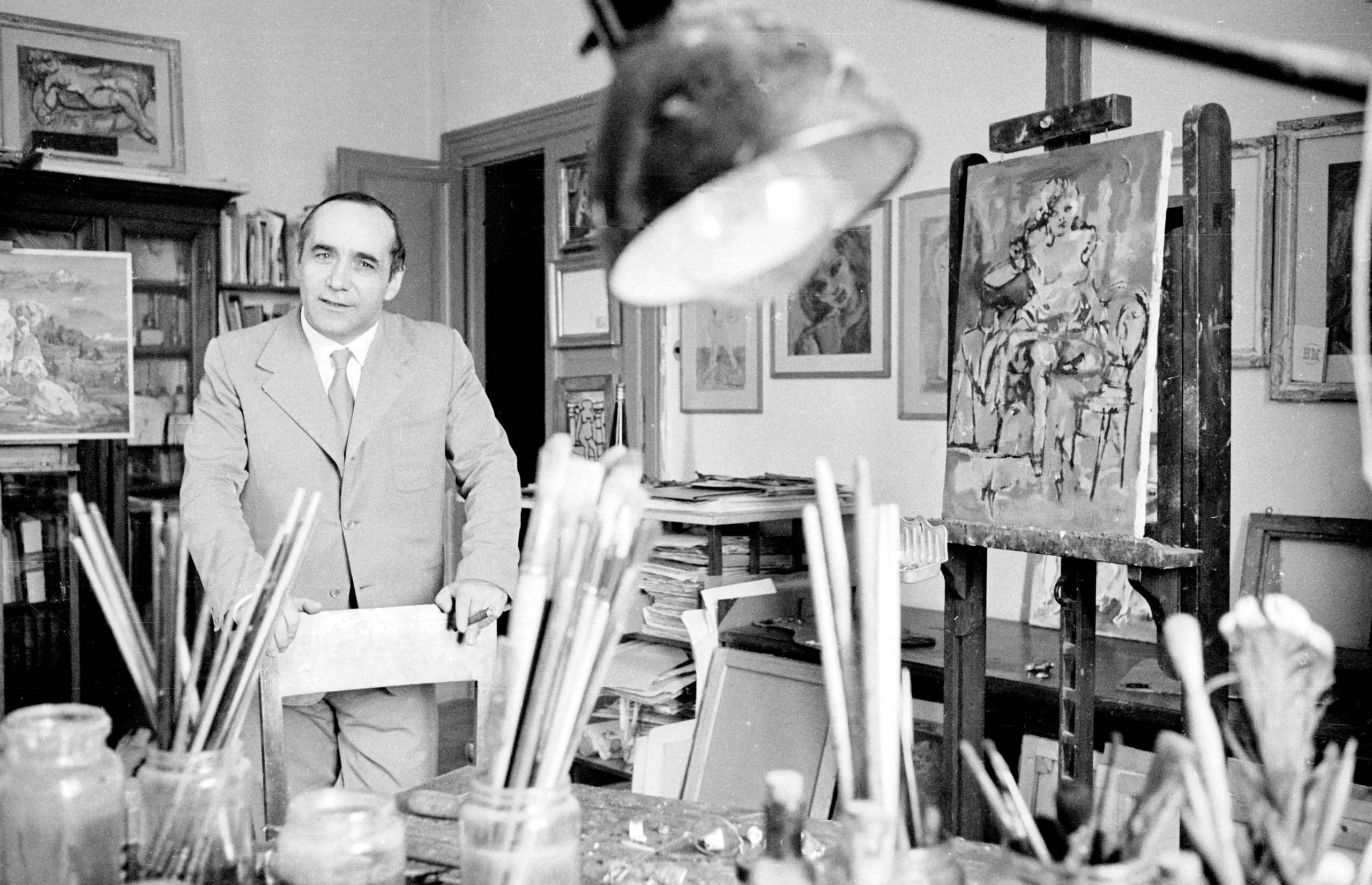 Black and white photograph of a man in a suit standing behind a chair in a painter's studio, surrounded by canvases, brushes, and art supplies