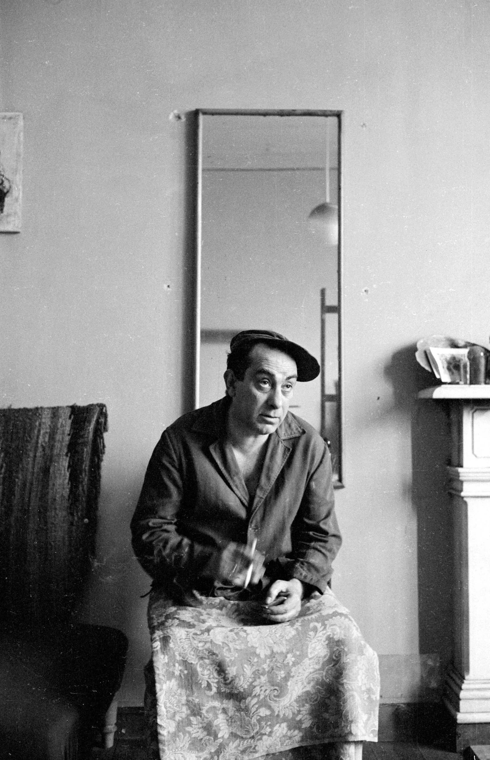 Black and white photograph of a man in a work shirt and flat cap seated on floral-draped surface, turning his gaze to the left, with a narrow mirror on the wall behind him