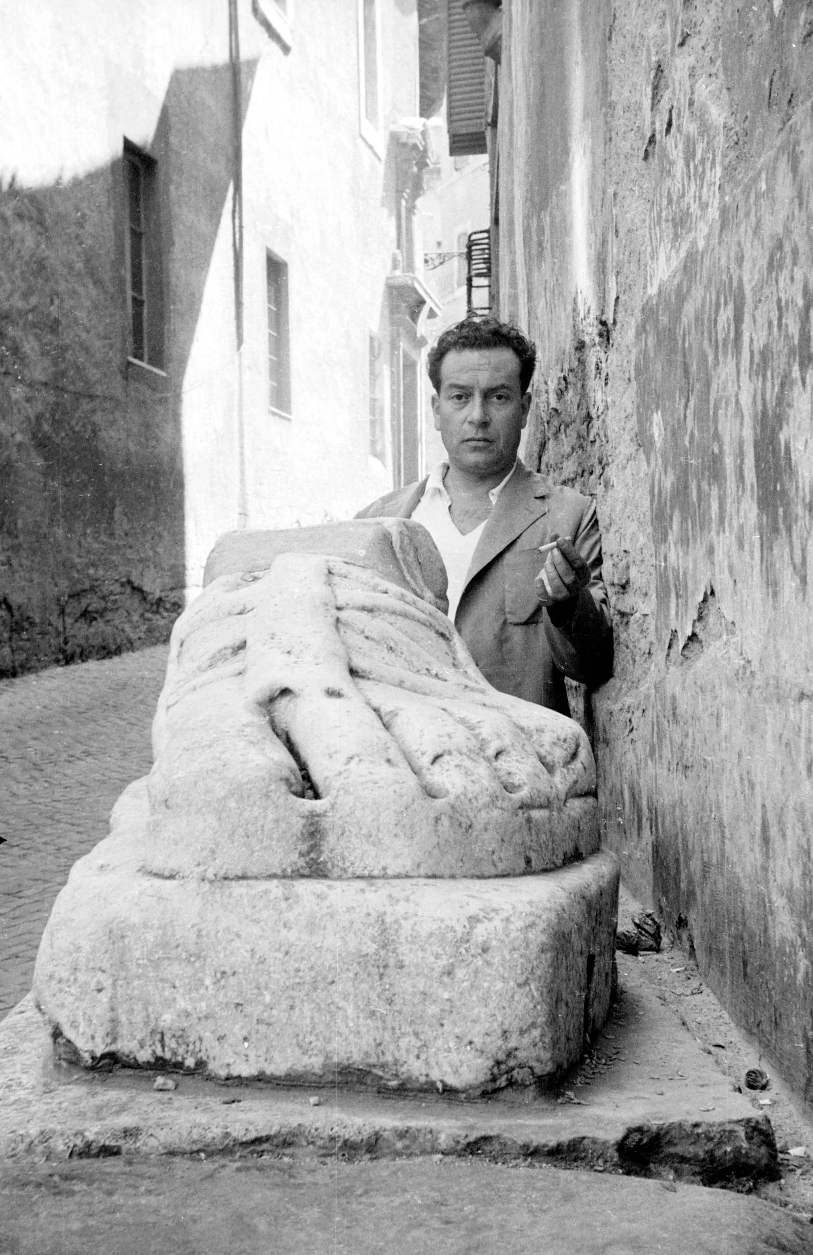 Black and white photograph of a man in a blazer leaning against a weathered wall beside a large fragment of ancient stone sculpture in a narrow cobblestone alley