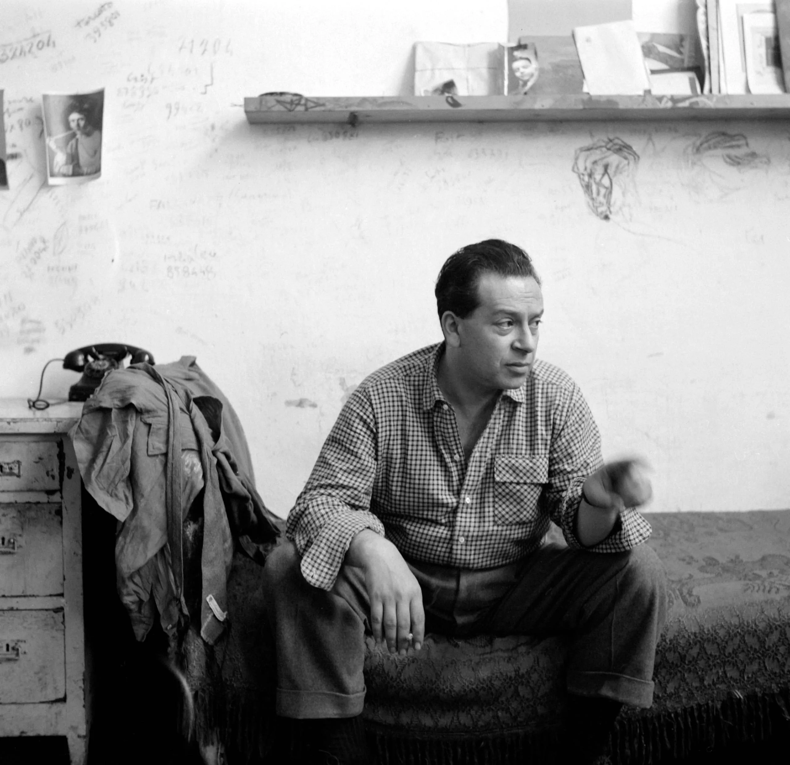 Black and white photograph of a heavyset man in a plaid shirt seated on a shaggy bench, turned to his left, in a studio with a scribbled white wall behind him