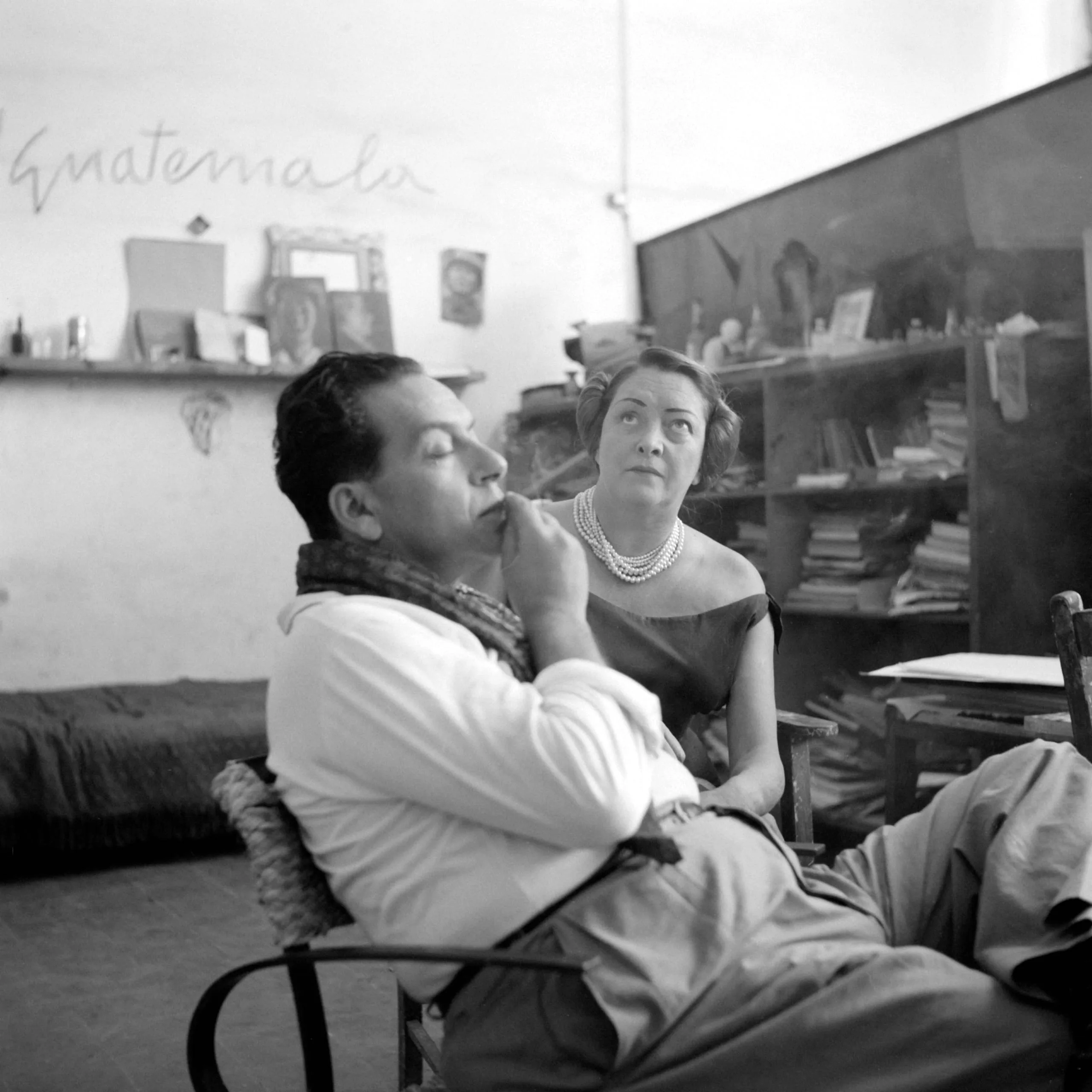 Black and white photograph of a man and woman seated in a cluttered room, the man in a white shirt with hand raised to his mouth, the woman in an off-shoulder top with pearl necklace gazing upward
