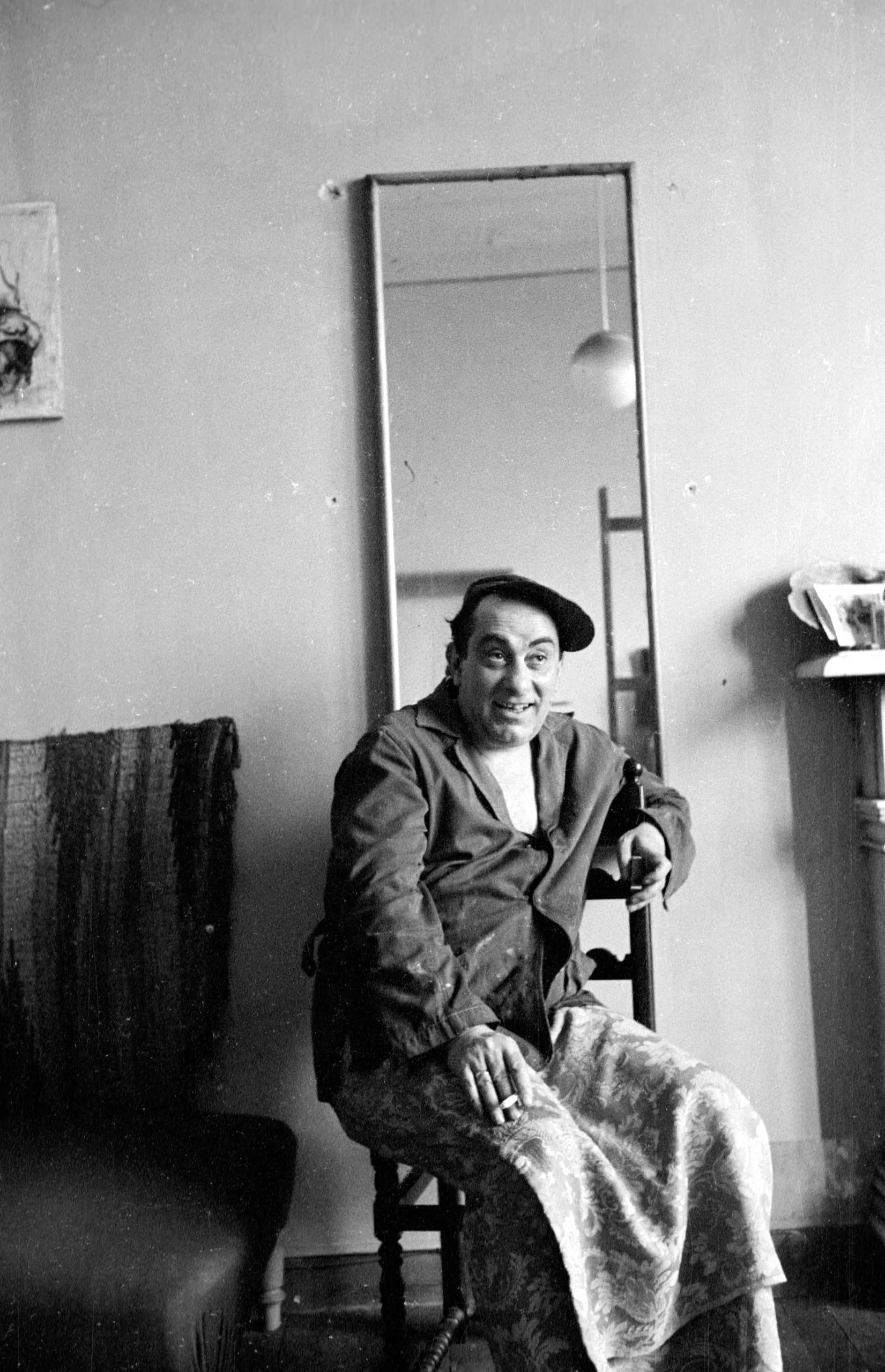 Black and white photograph of a white man in a beret and work jacket, seated in a wooden chair and grinning at the camera, a tall mirror visible behind him