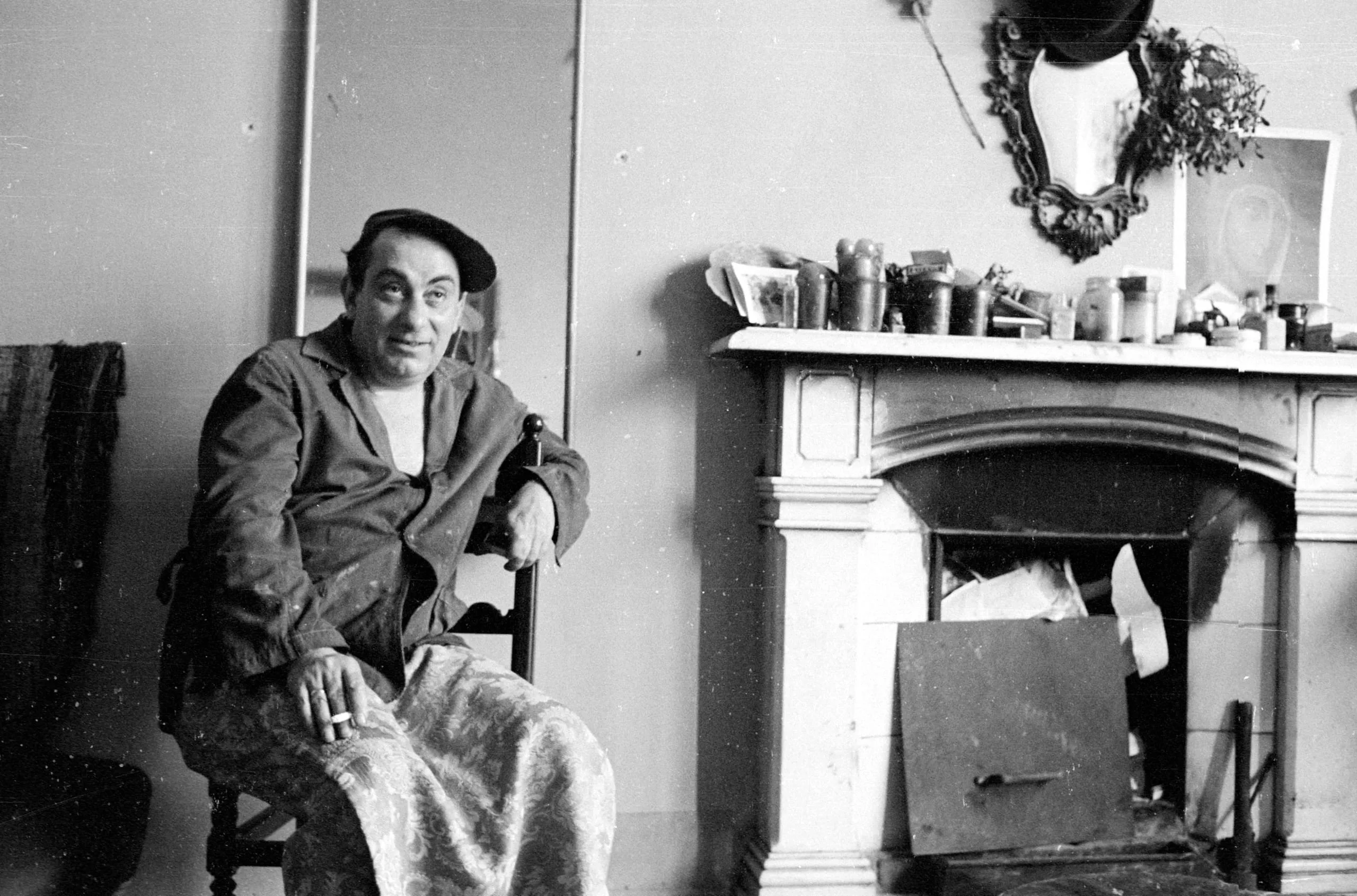 Black and white photograph of a man in a flat cap and paint-spattered jacket seated in a wooden chair, grinning at the camera, beside a fireplace mantel crowded with paint jars and brushes