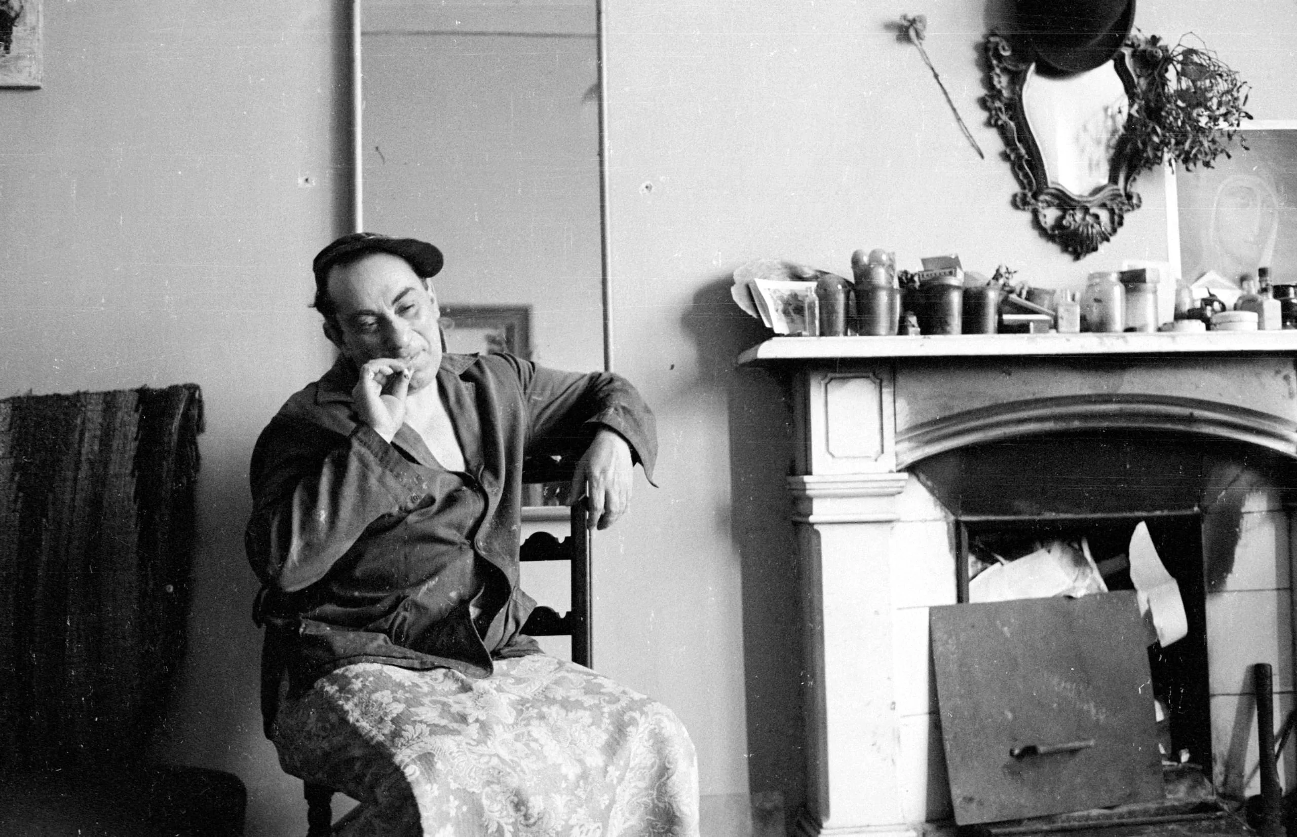 Black and white photograph of a white man in a flat cap and dark jacket seated in a chair, chin resting on his hand, beside a cluttered fireplace mantel