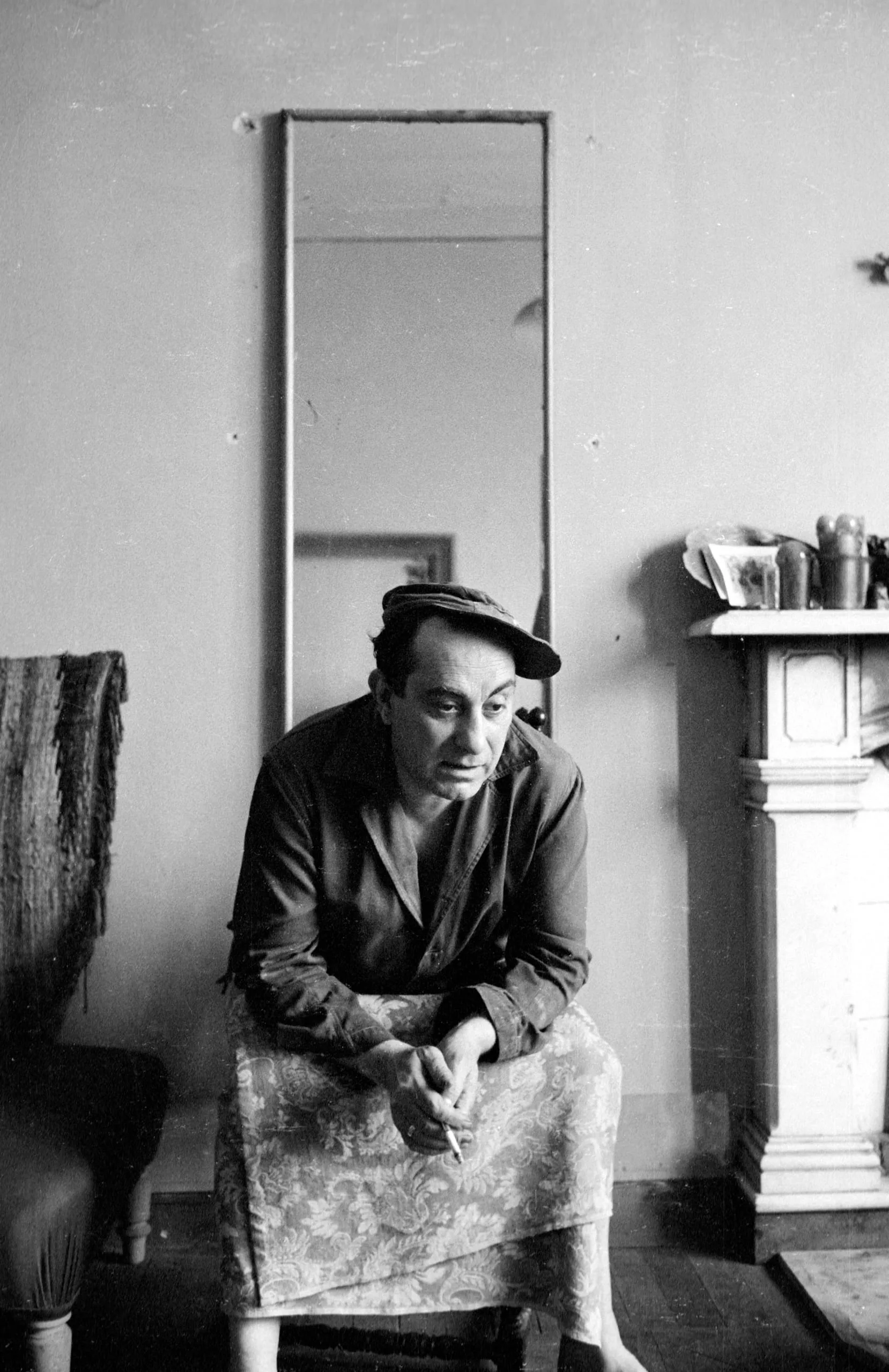 Black and white photograph of a man in a flat cap and work shirt seated on a floral chair, leaning forward with hands clasped, a mirror and fireplace mantel visible behind him