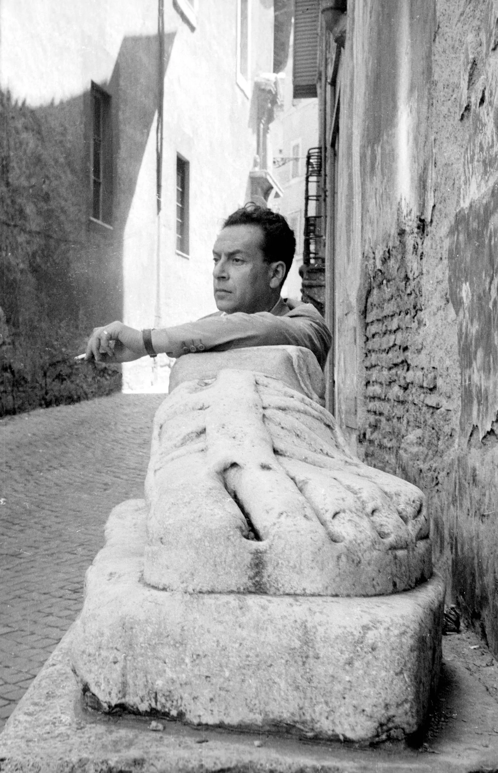 Black and white photograph of a man leaning on a large ancient stone foot sculpture fragment on a cobblestone street, cigarette in hand