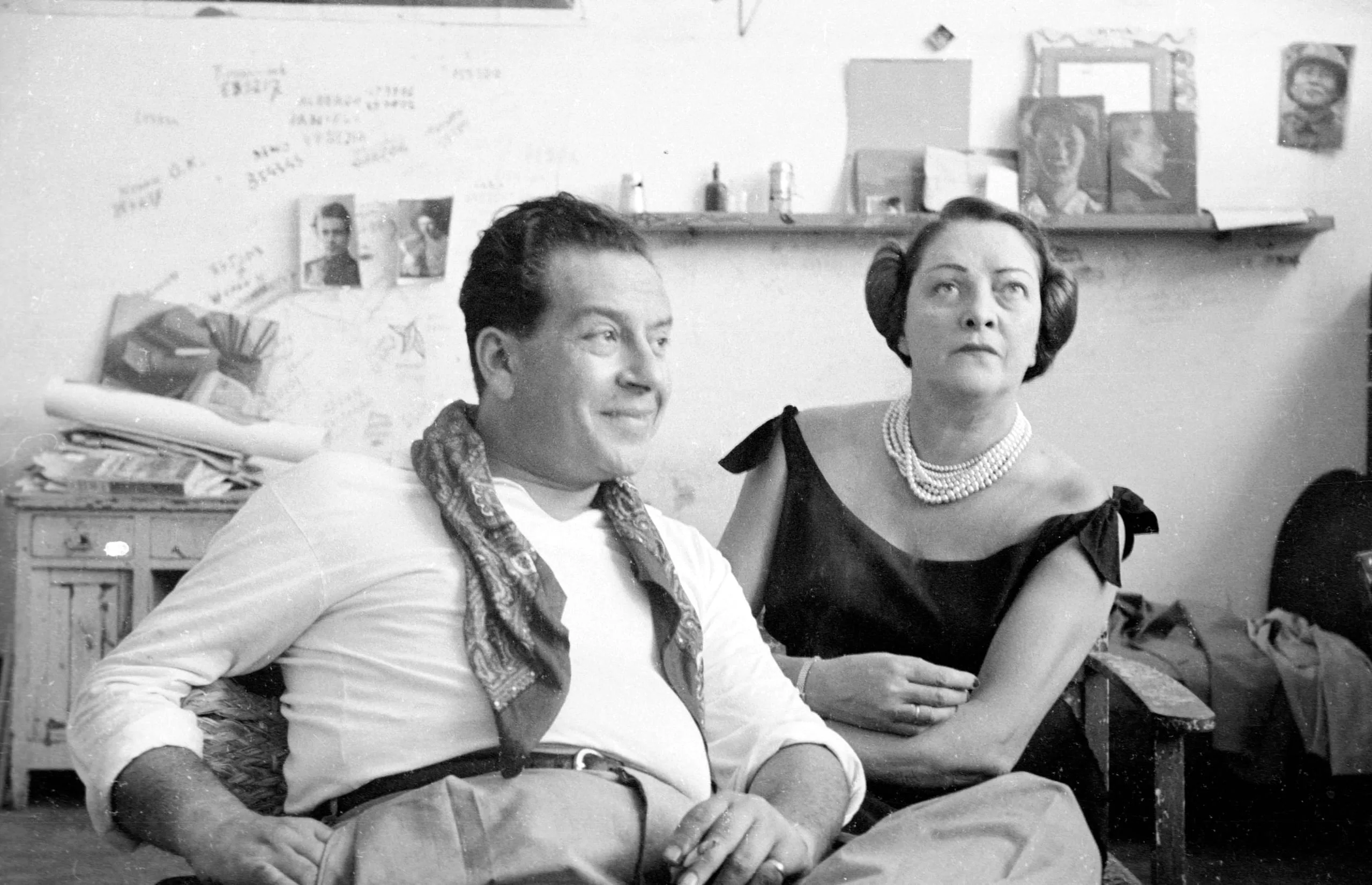 Black and white photograph of a man and woman seated indoors, looking upward and to the left, against a wall covered with pinned papers and photographs