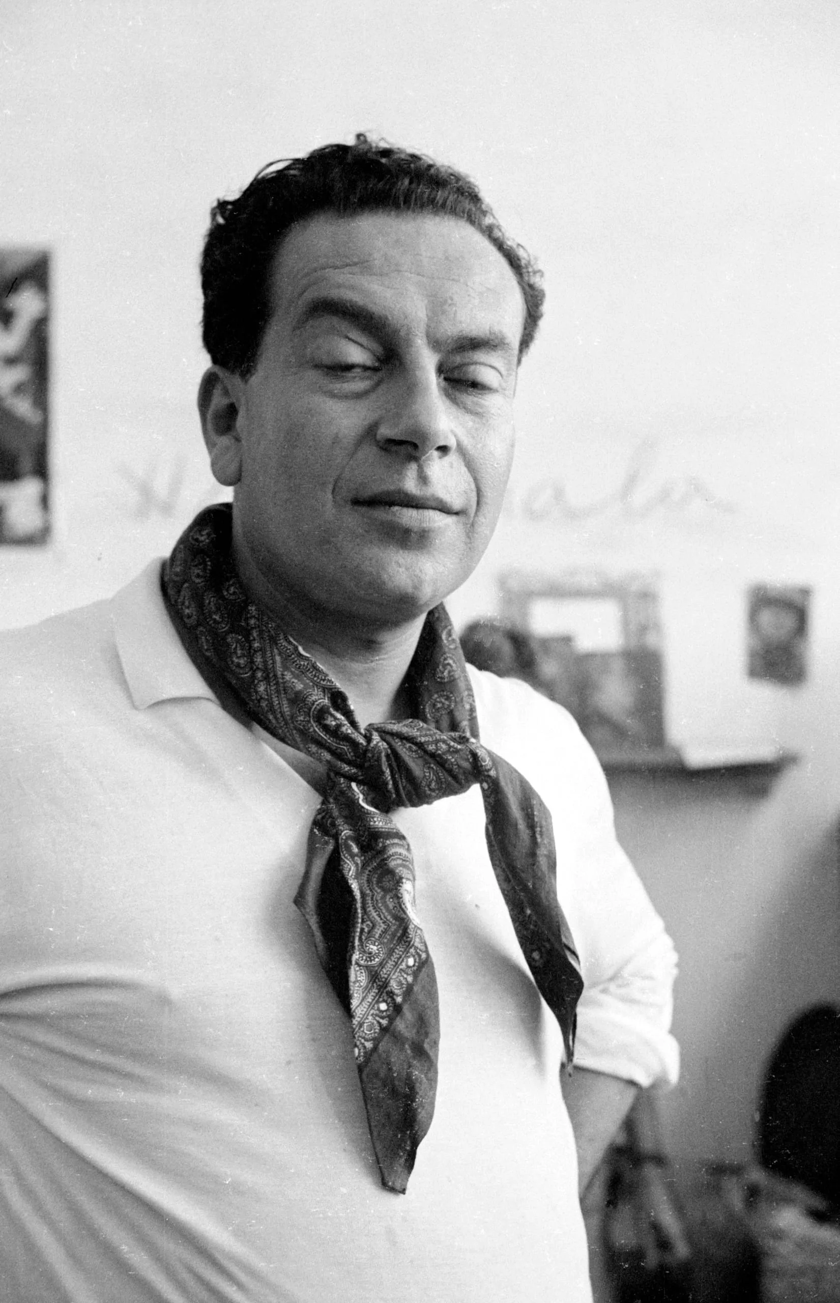 Black and white photograph, chest-up portrait of a man with dark wavy hair, eyes closed, wearing a white polo shirt and a patterned scarf knotted at his throat