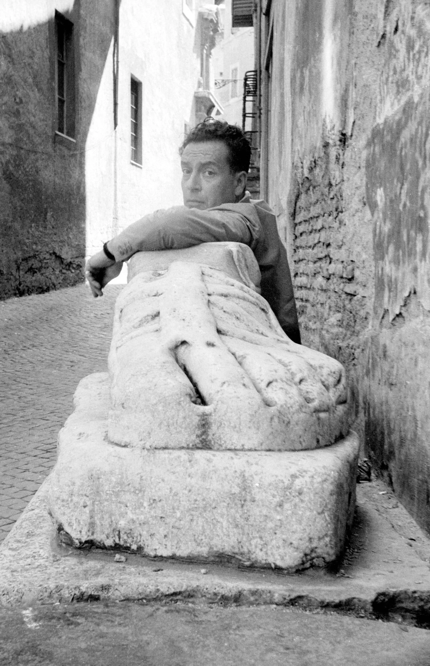 Black and white photograph of a man leaning over an enormous ancient marble foot sculpture in a narrow cobblestone alley