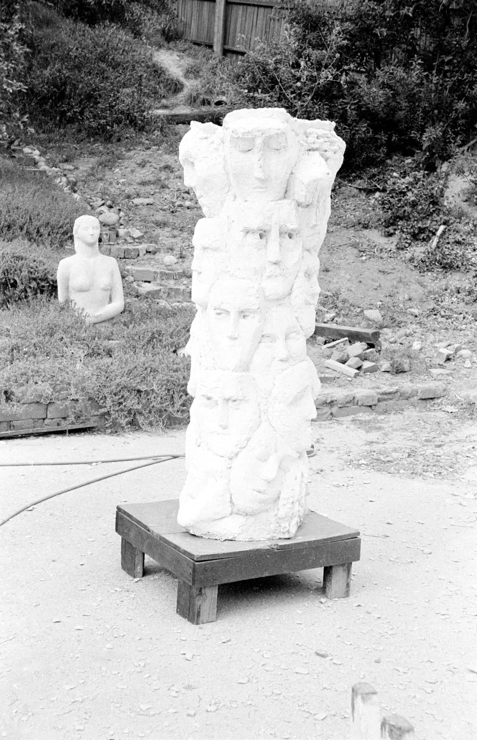 Black and white photograph of a pale plaster column sculpture covered with stacked human faces in relief, displayed on a low wooden platform outdoors
