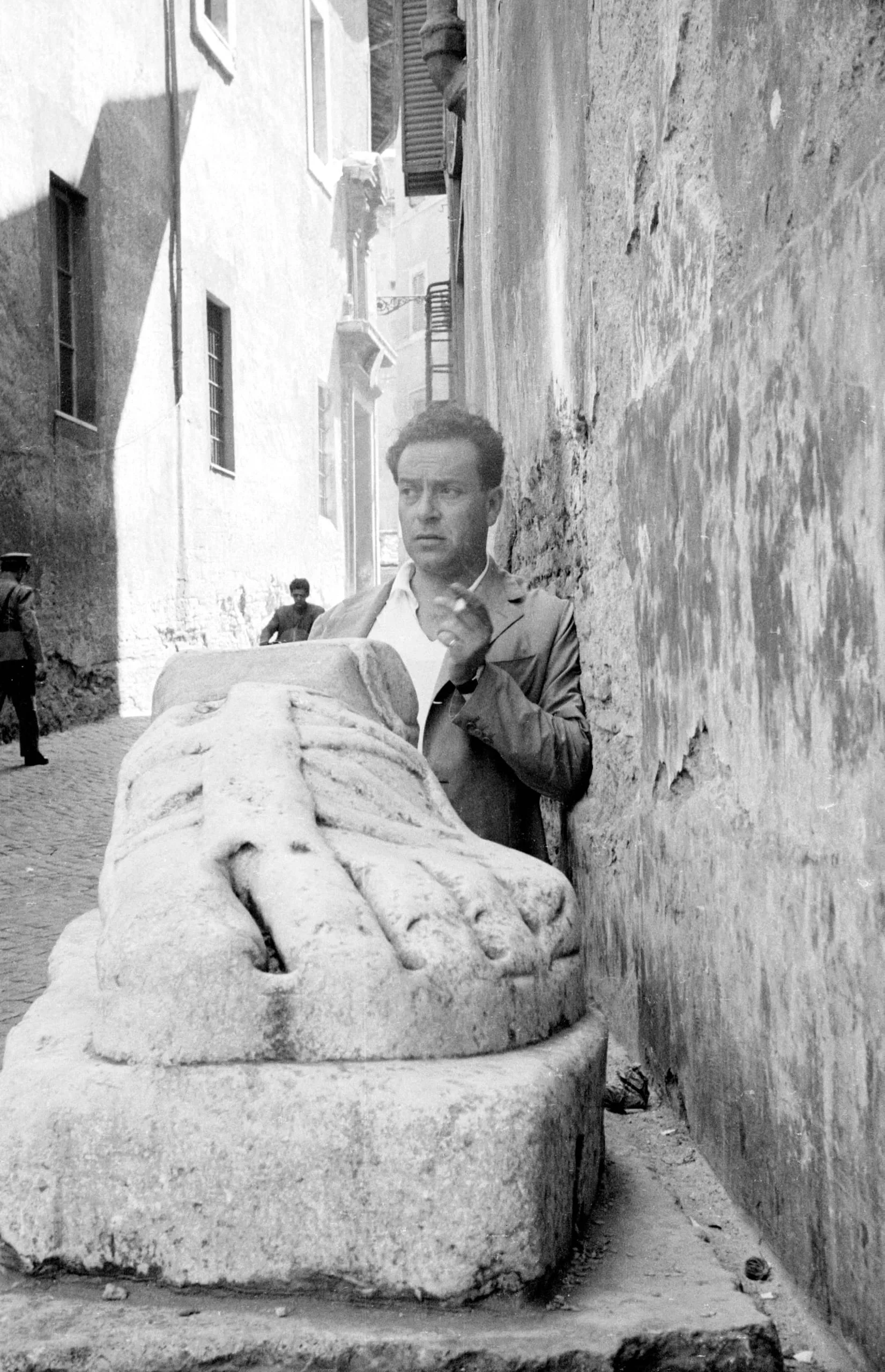Black and white photograph of a man leaning against a peeling stucco wall beside a large ancient marble foot sculpture in a narrow cobblestone alley
