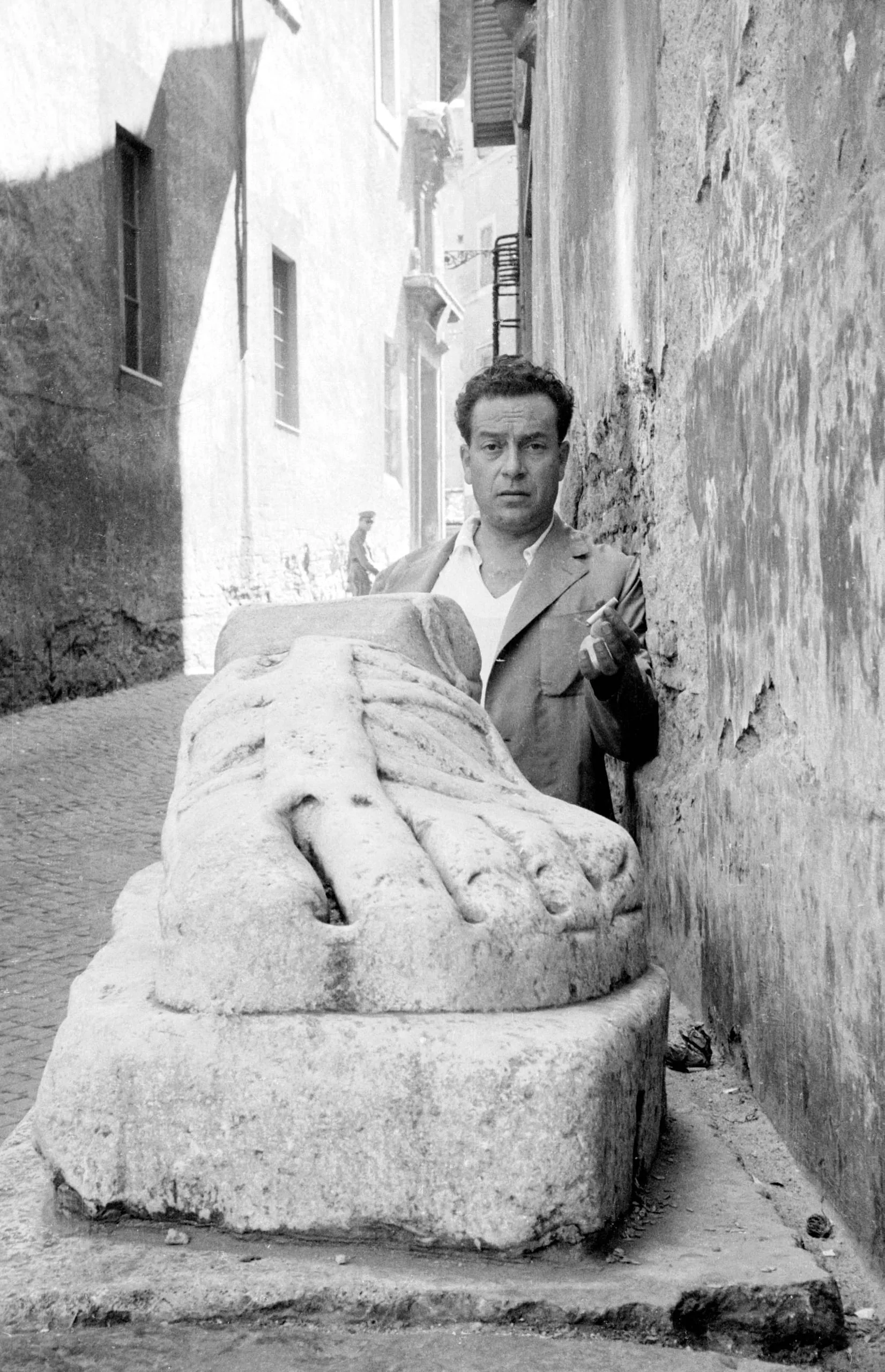 Black and white photograph of a man standing beside a large ancient stone sculpture fragment of a draped foot in a narrow cobblestone alley