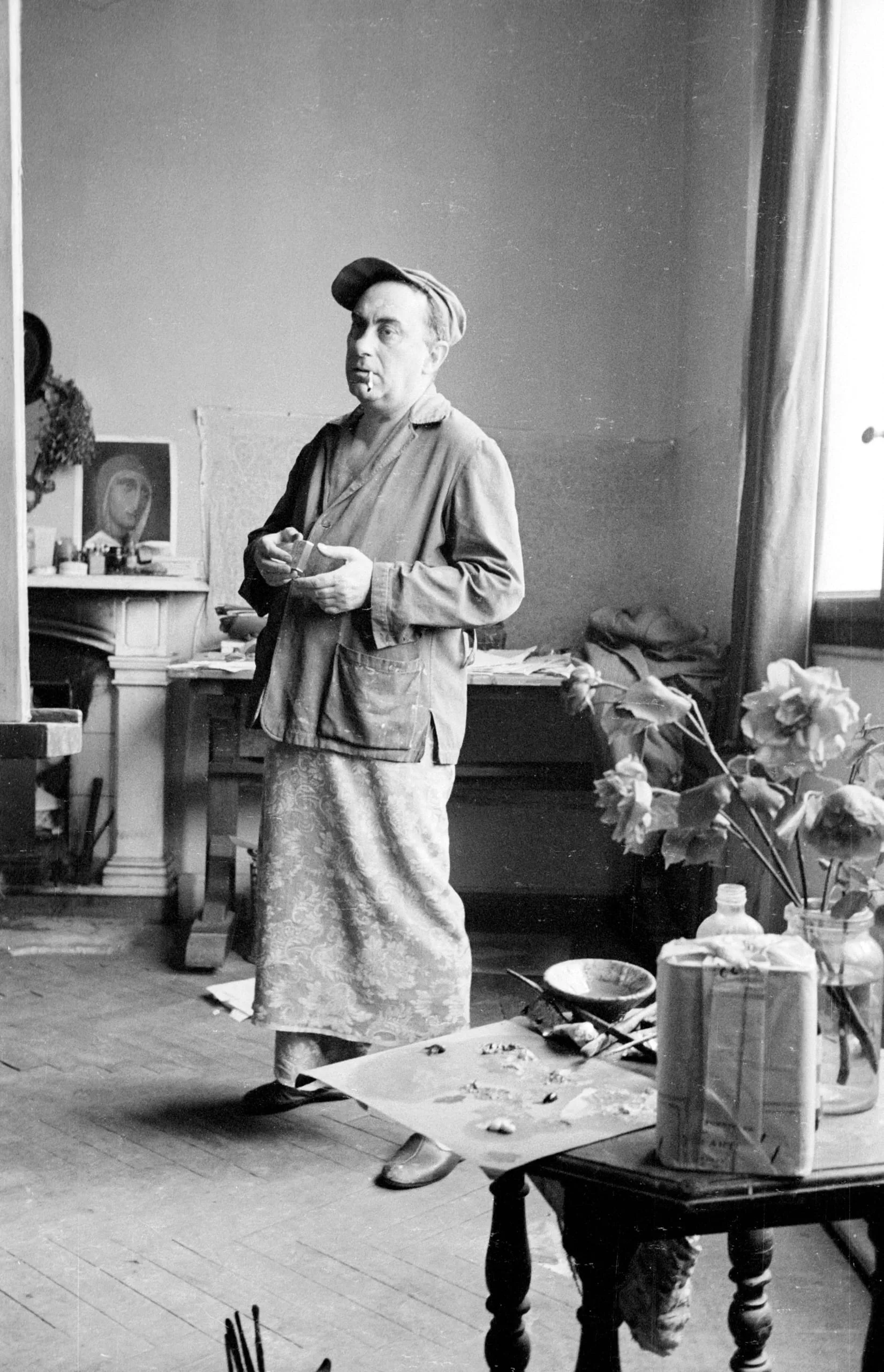 Black and white photograph, full-length view of a man in a flat cap, jacket, and patterned ankle-length skirt standing in an artist's studio