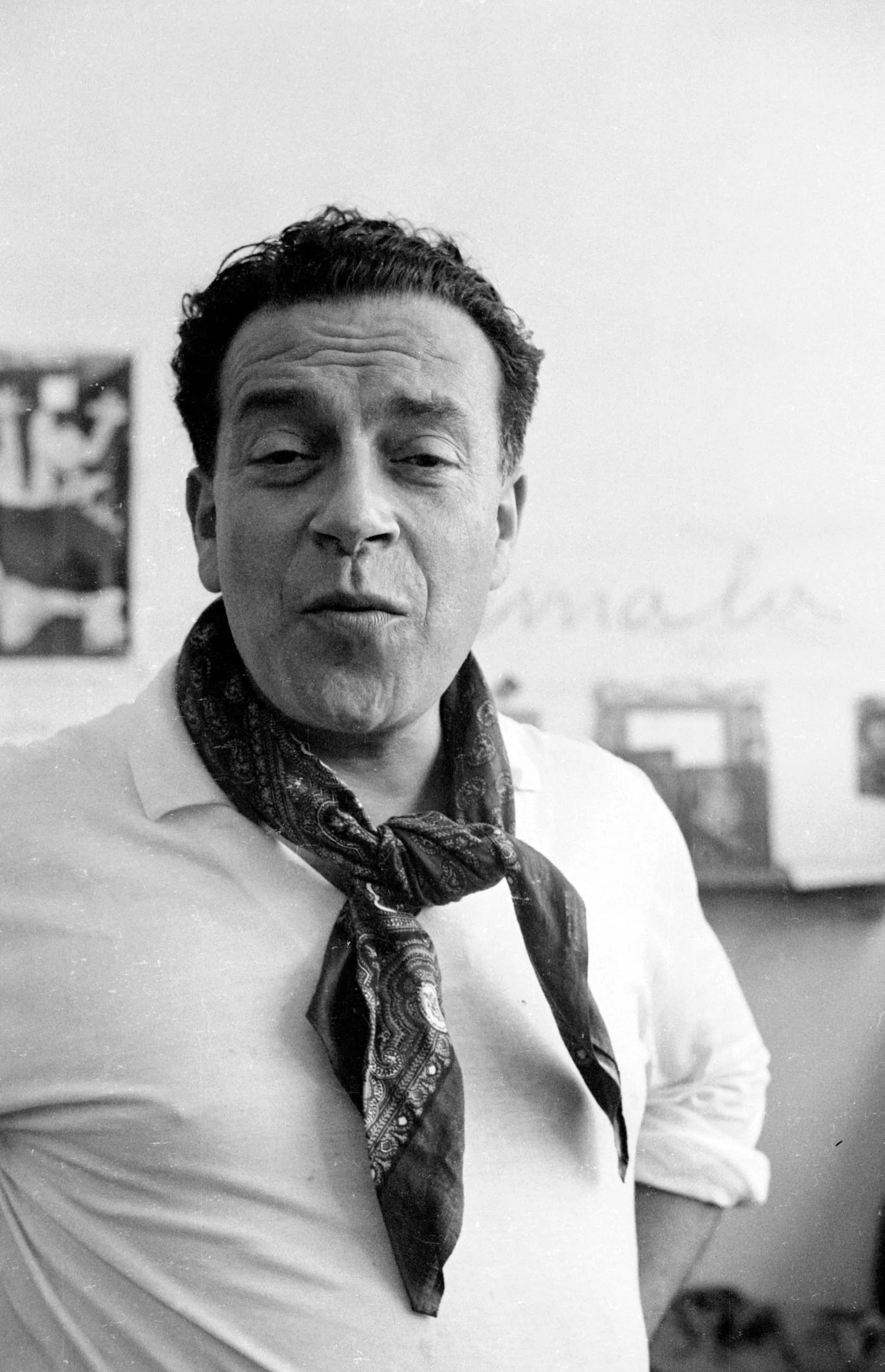 Black and white photograph, waist-up portrait of a man in a white shirt and patterned scarf knotted at the throat, soft lighting, abstract artwork visible on wall behind him