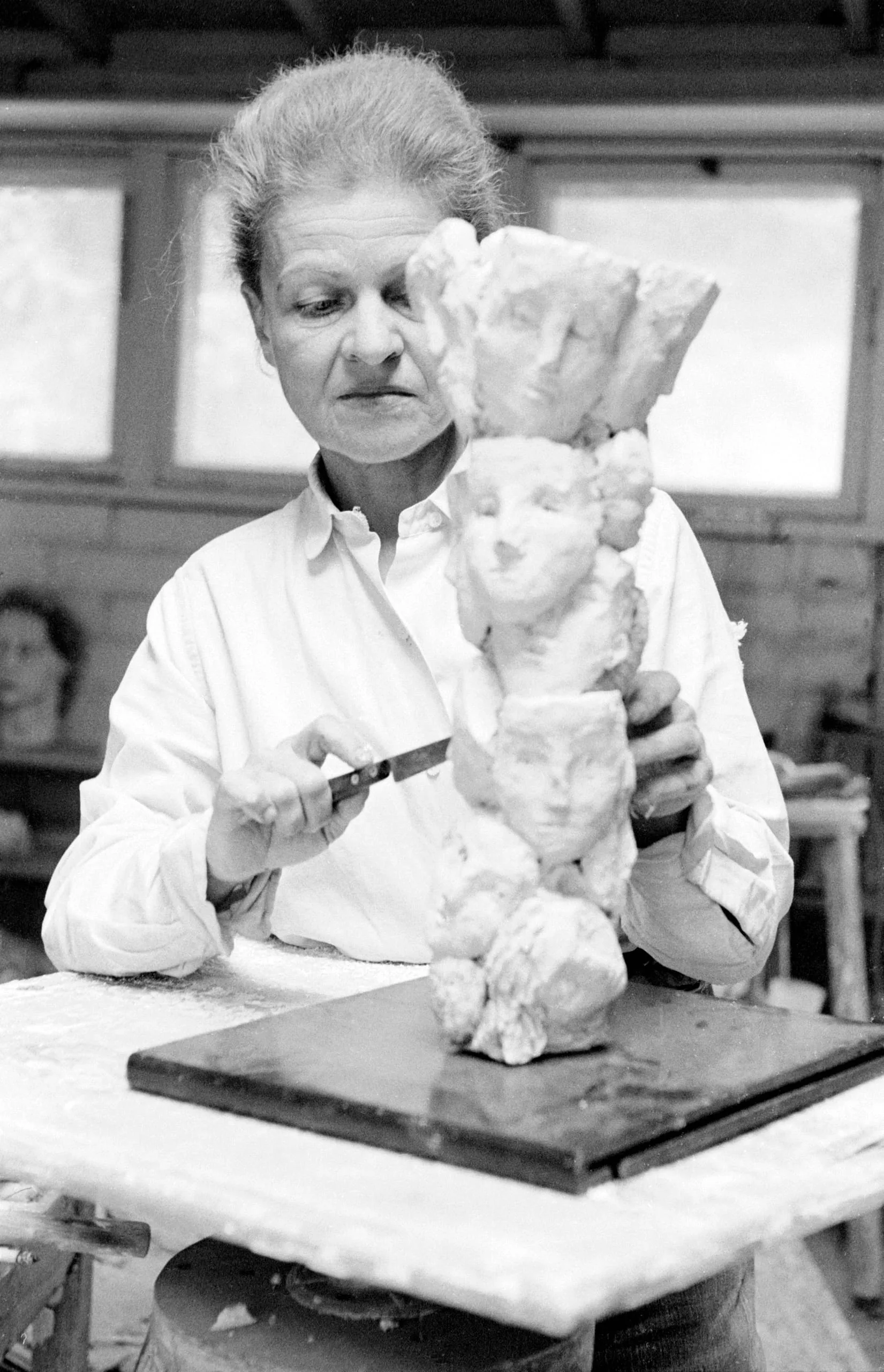 Black and white photograph of a woman in a white shirt sculpting a plaster figure in a studio, holding a carving tool