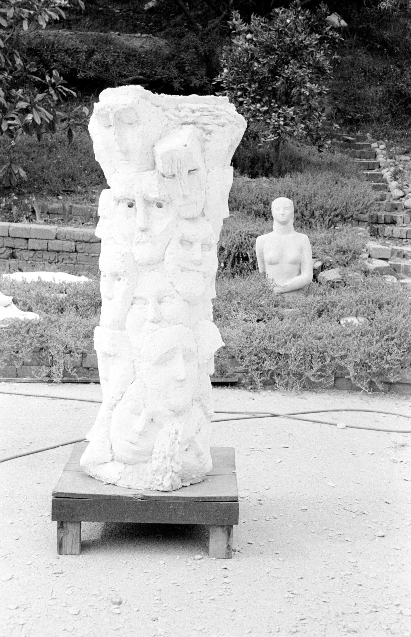Black and white photograph of two pale plaster sculptures in a garden: a tall column carved with stacked human faces on a wooden platform, and a smooth seated torso figure in the background