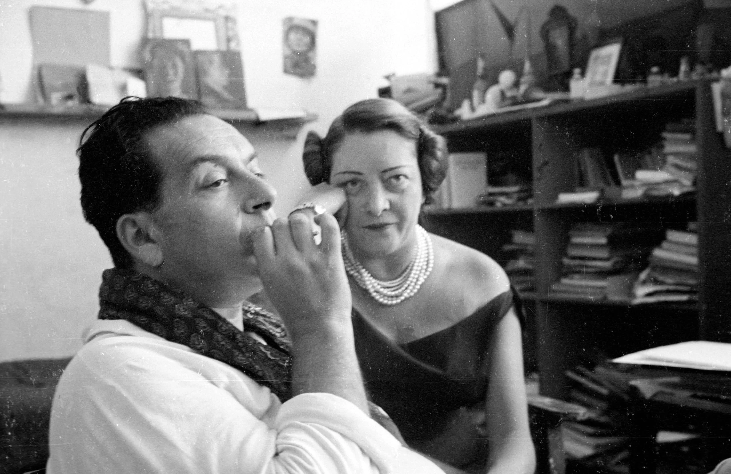Black and white photograph of a man holding a cigar to his lips beside a woman wearing a pearl necklace, seated in a room with crowded bookshelves behind them