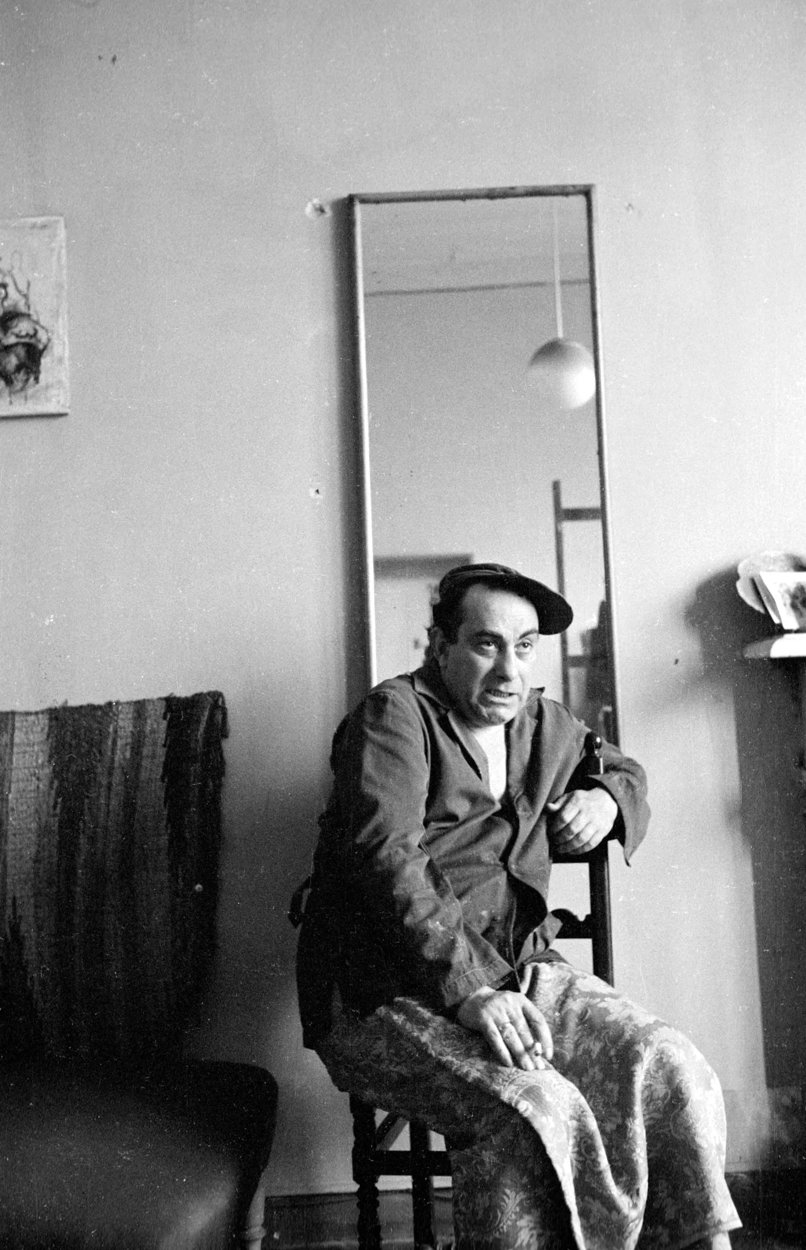 Black and white photograph of a man in a beret and dark jacket seated on a wooden chair in an interior, with a tall mirror and hanging lamp visible behind him