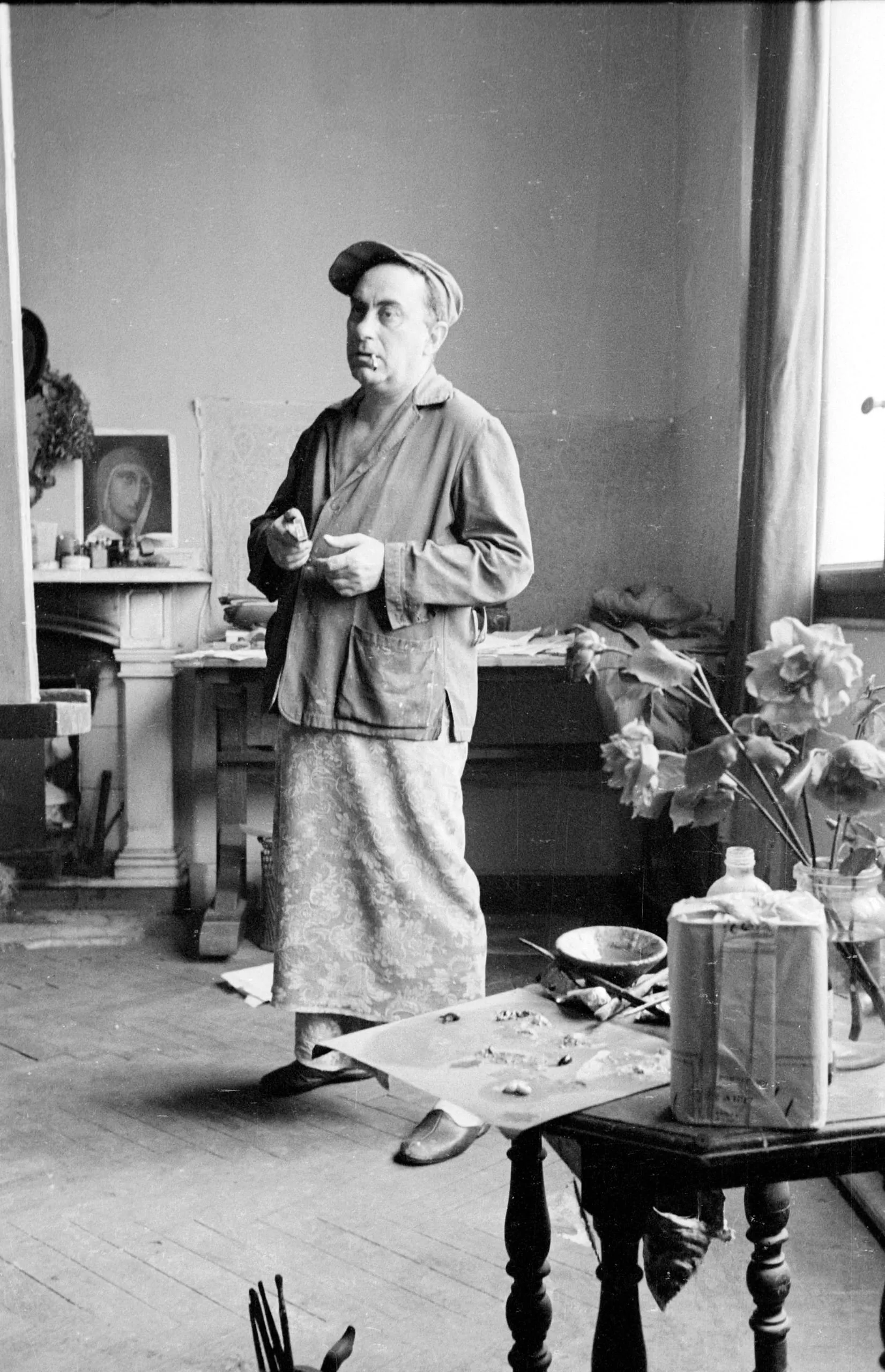 Black and white photograph of a man in a work jacket, apron, and flat cap standing in an artist's studio, surrounded by paints, brushes, and flowers