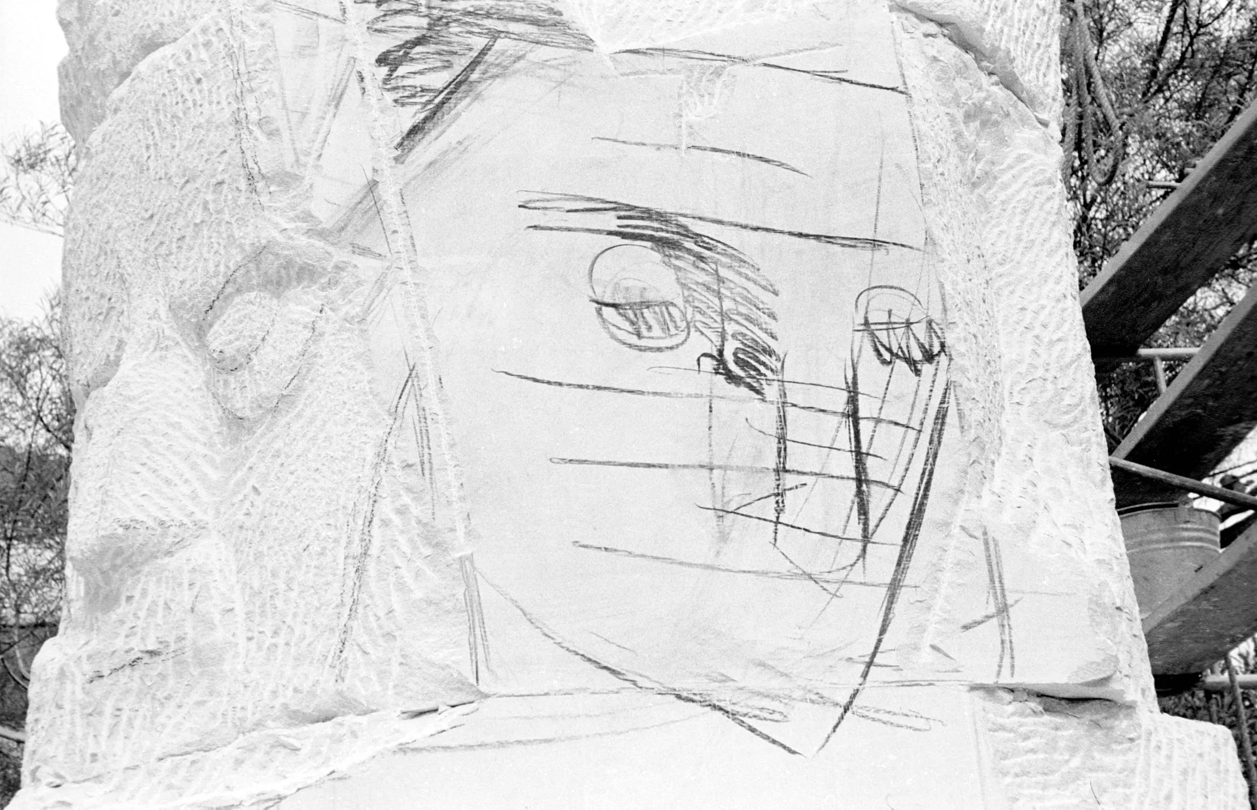 Black and white photograph of a large rough-edged white stone block with a bold, gestural face sketched in pencil or chalk on its flat surface, photographed outdoors