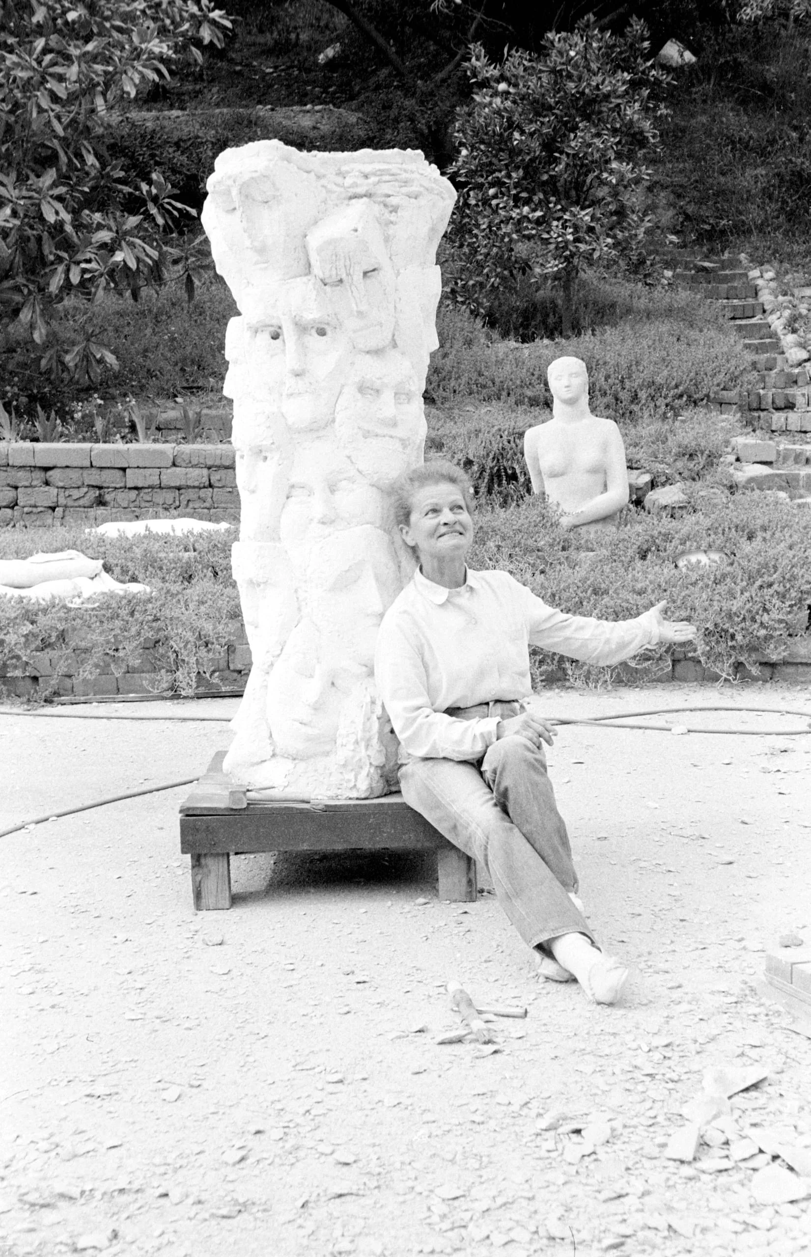 Black and white photograph of a woman seated beside a tall plaster column sculpture carved with stacked human faces, outdoors in a sculpture garden