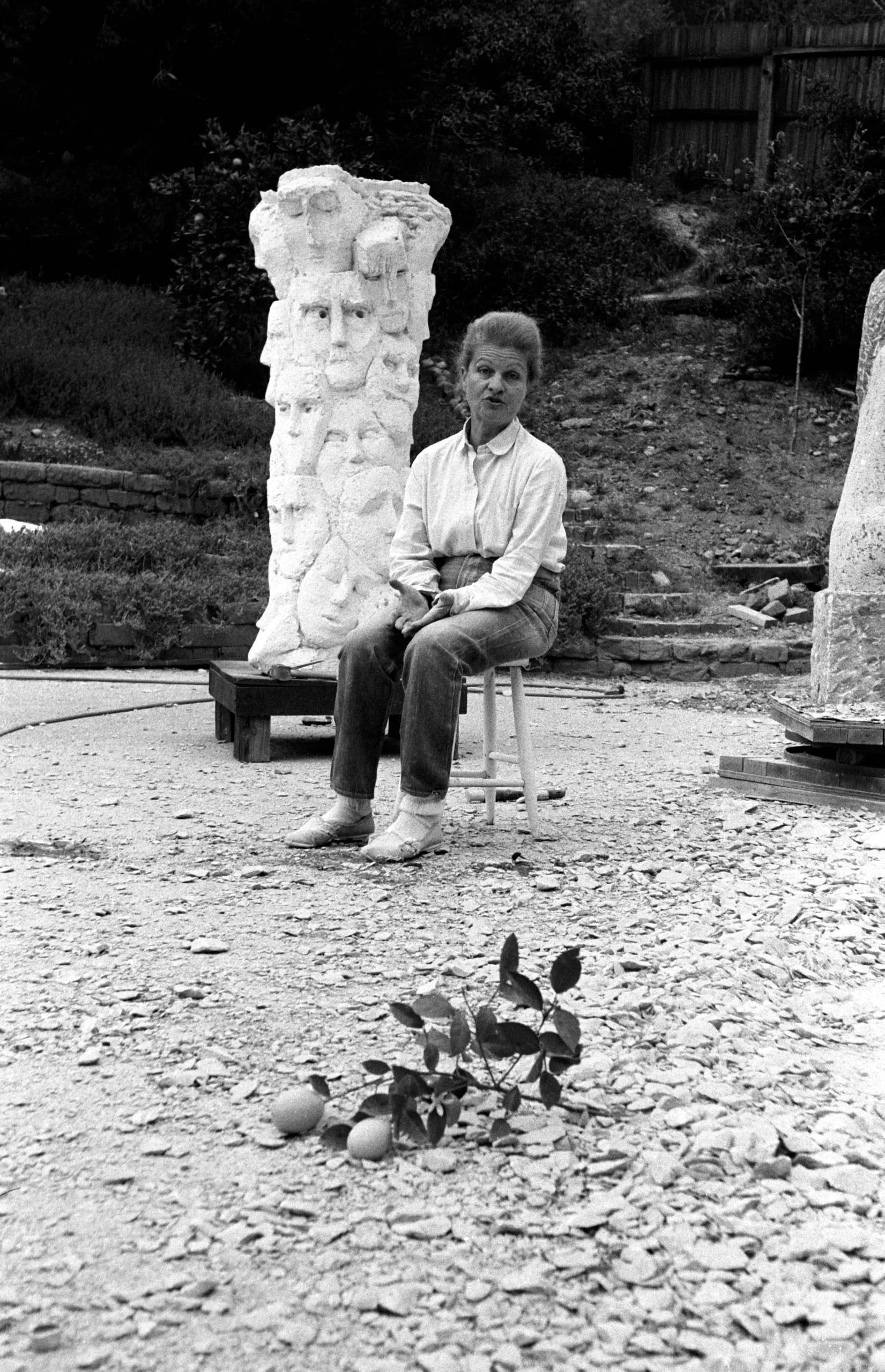 Black and white photograph of a woman seated on a stool outdoors beside a tall carved stone column bearing multiple stacked human faces in relief