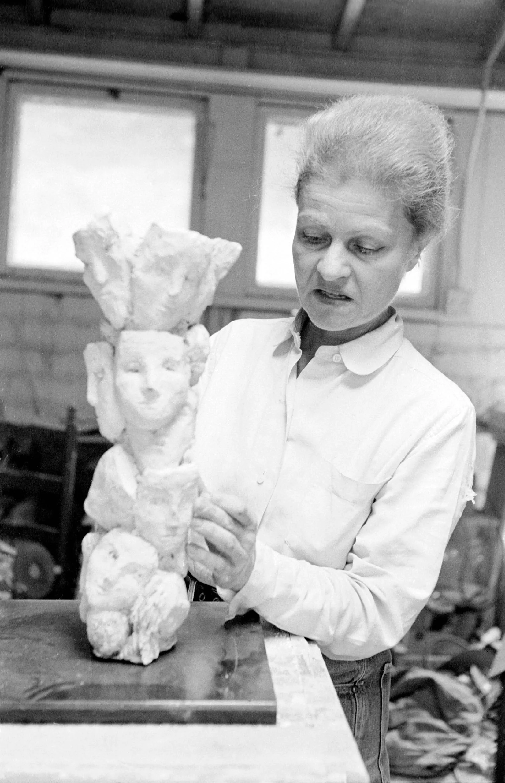 Black and white photograph of a person with short gray hair examining a small plaster figure sculpture in a dimly lit studio