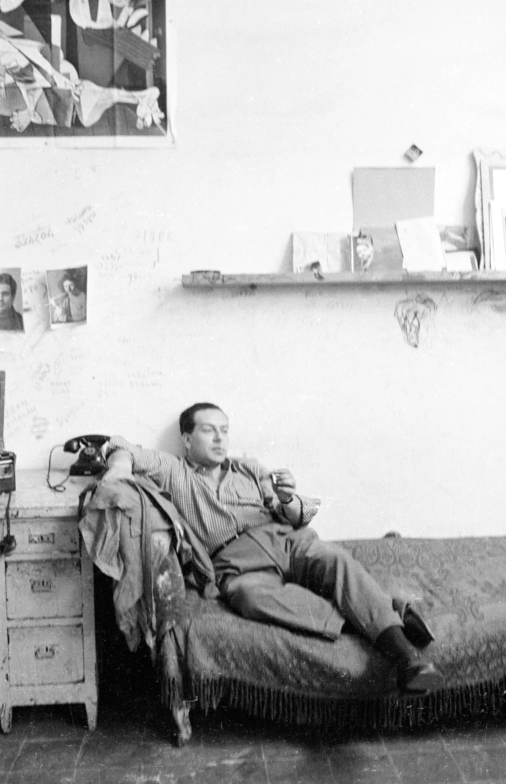 Black and white photograph of a man reclining on a fringed chaise longue in a cluttered room, eyes closed, holding a small cup, with a large reproduction print on the wall above