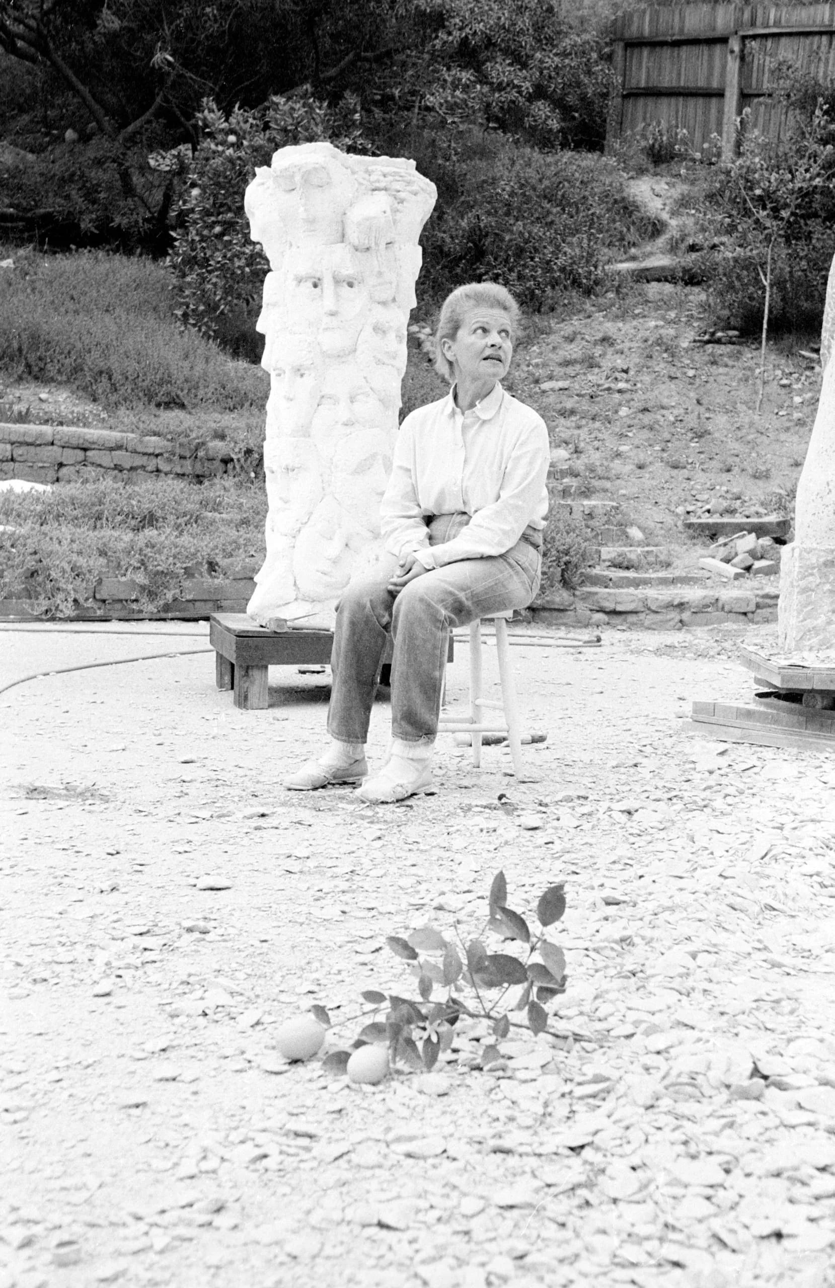 Black and white photograph of a woman seated on a stool outdoors beside a tall white plaster sculpture with a modeled face, in a gravel-covered work yard
