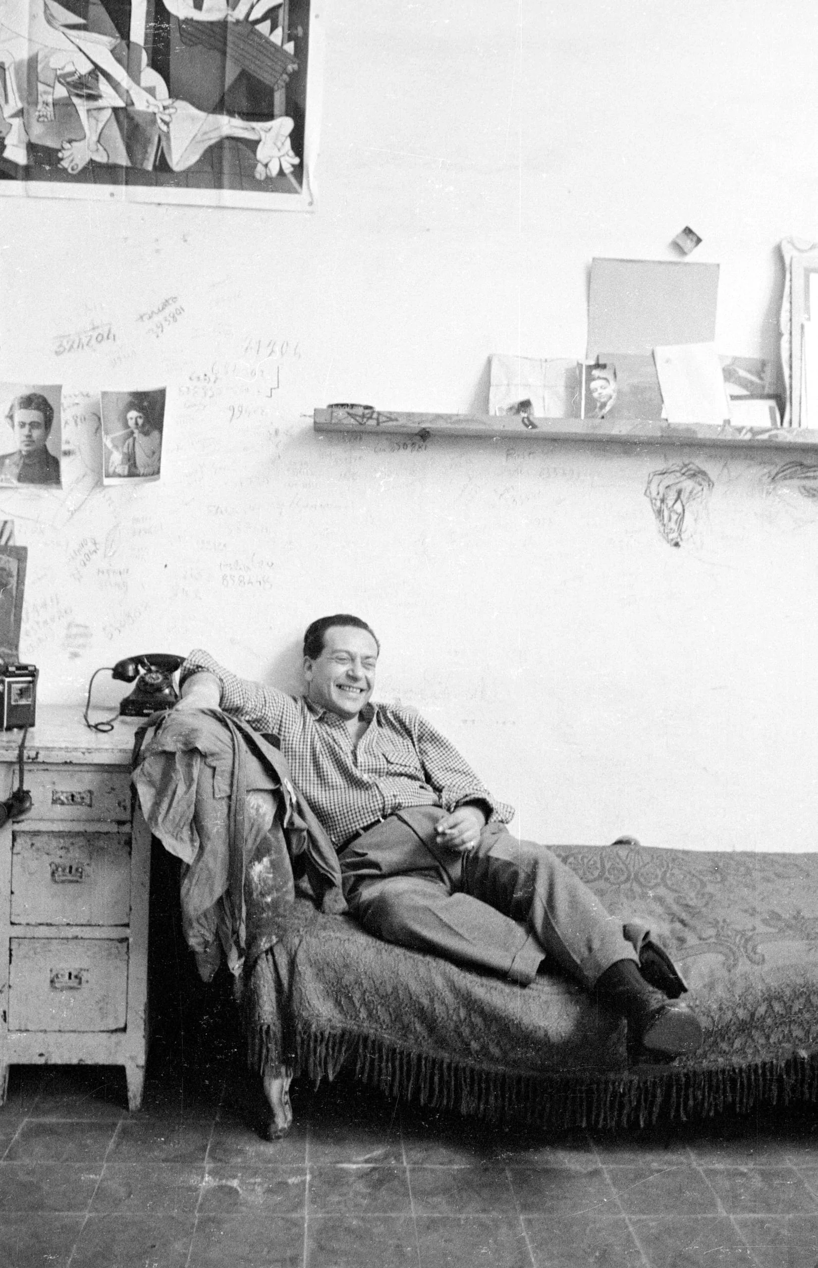 Black and white photograph of a man with brown skin reclining on a fringed daybed, smiling broadly, against a white wall covered in writings, sketches, and pinned photographs