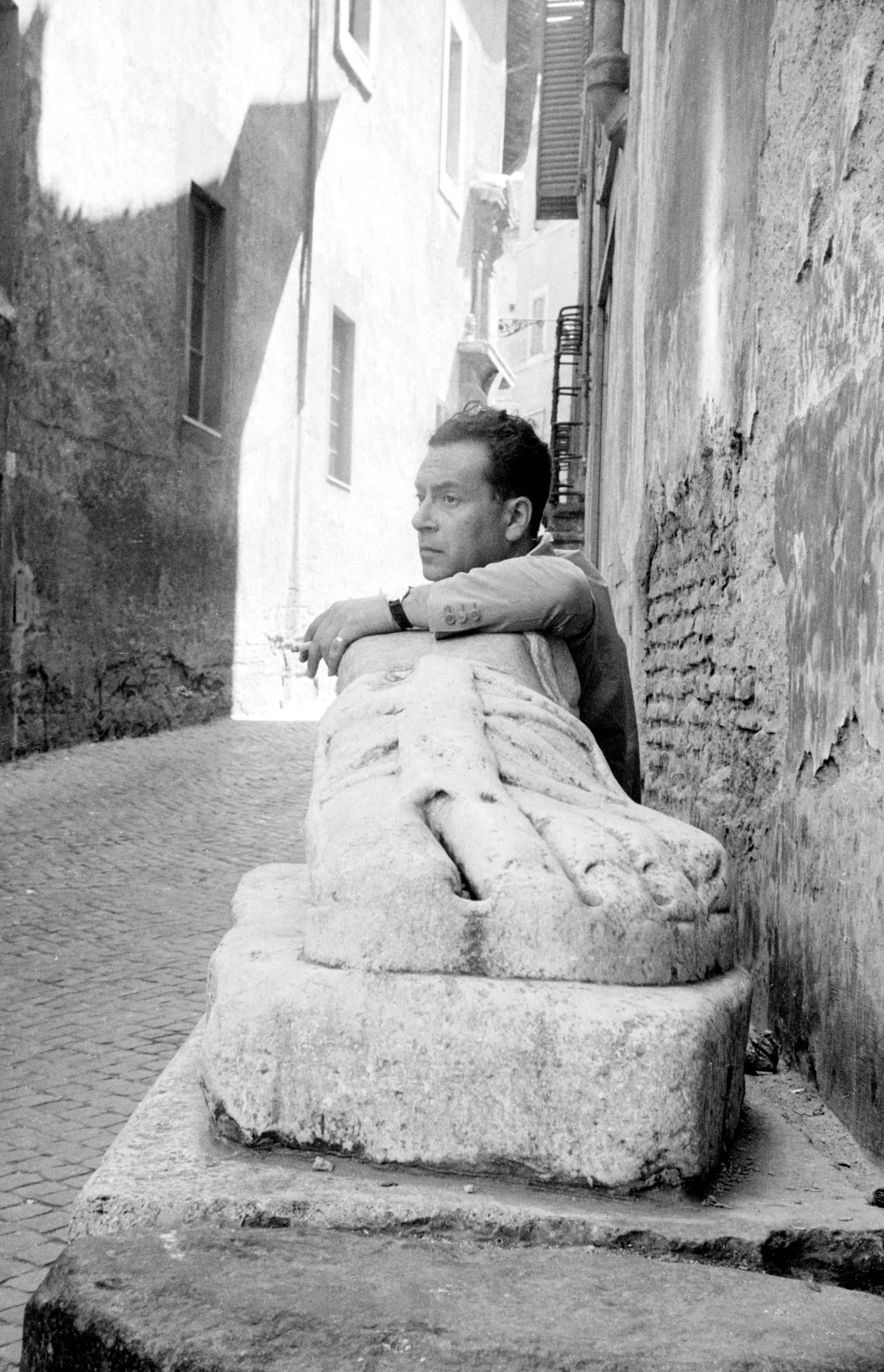 Black and white photograph of a man leaning over an ancient, heavily eroded stone sculpture on a narrow cobblestone alley flanked by aged building facades