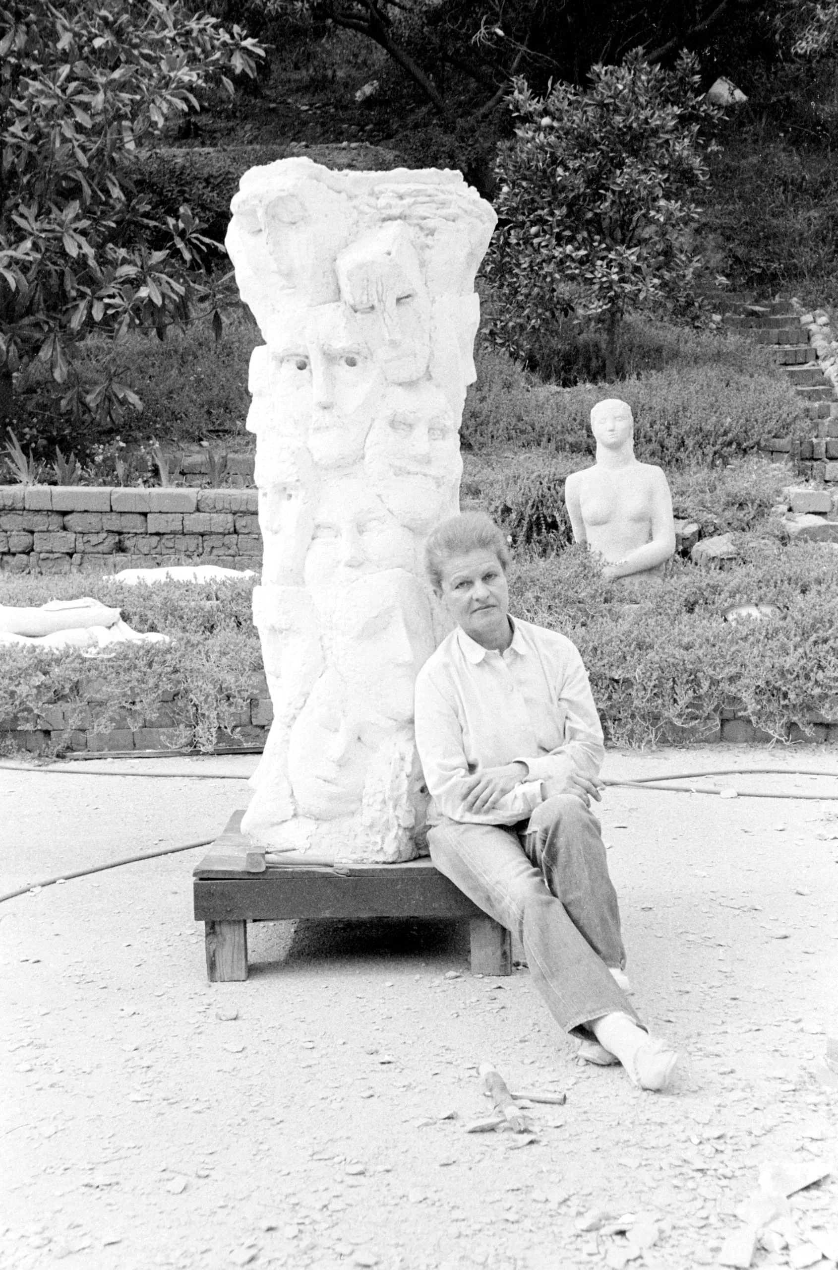 Black and white photograph of a person sitting cross-legged on a wooden platform in front of a tall stone column carved with human faces, outdoors in a garden setting
