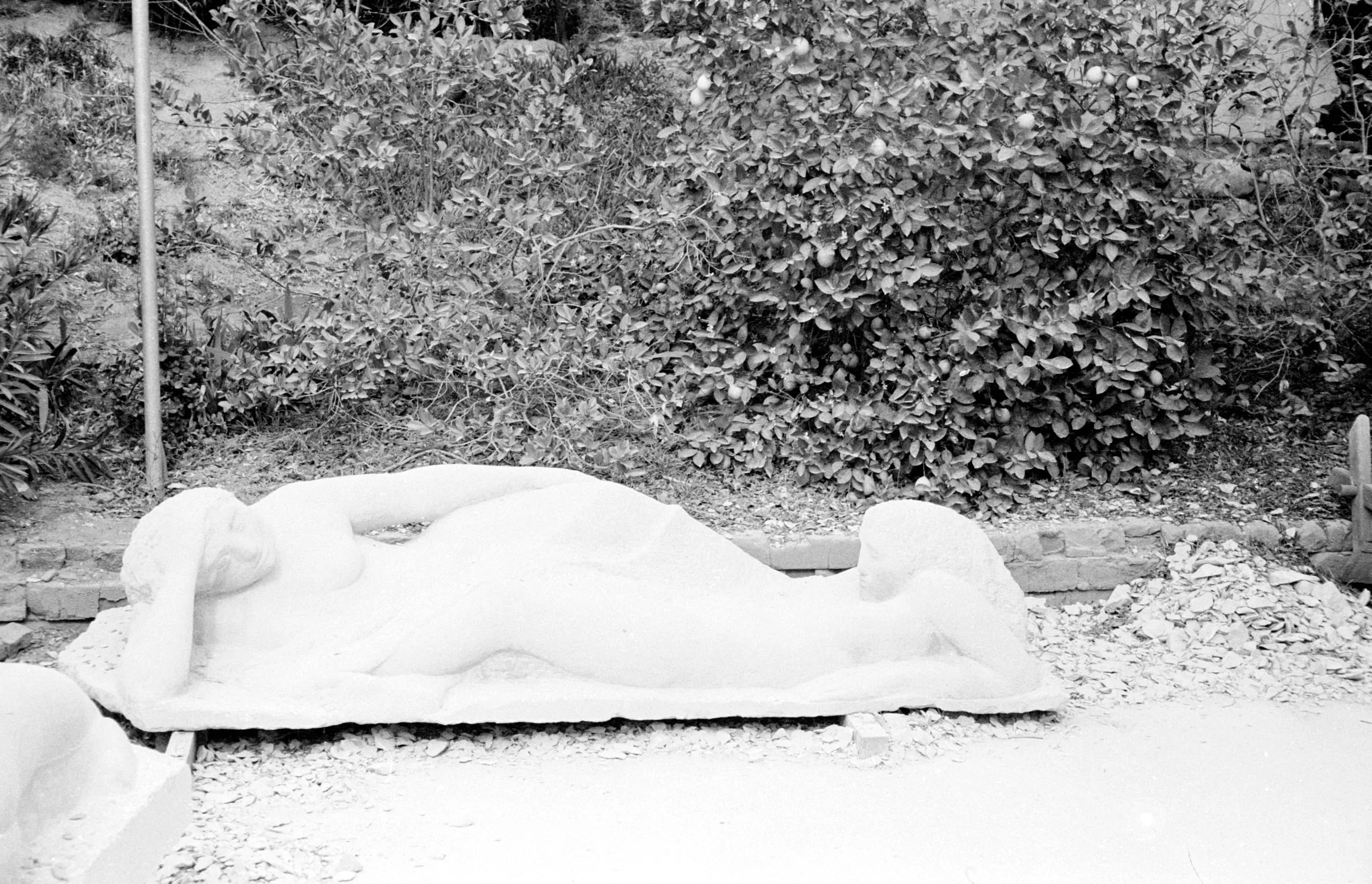 Black and white photograph of a large white stone reclining figure sculpture on a flat outdoor slab, surrounded by gravel and dense shrubbery