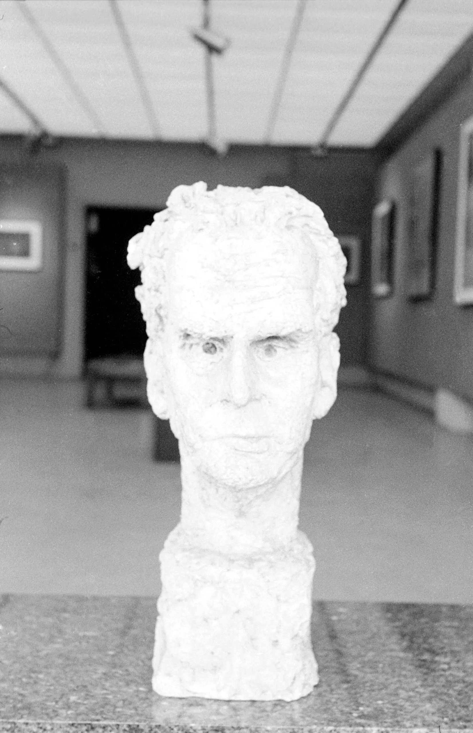 Plaster bust of a man facing forward, with rough textured surface and expressive tool marks, displayed on a rectangular plinth in a gallery