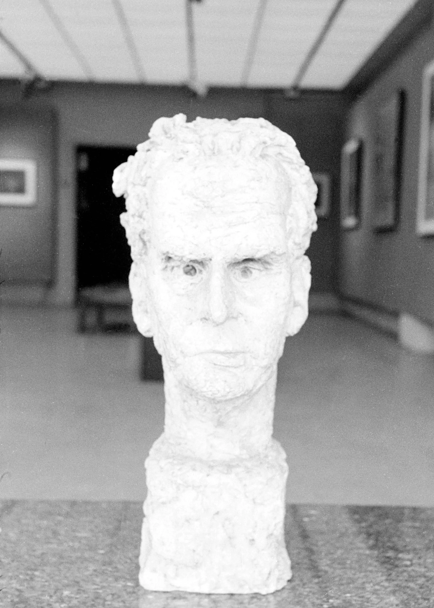 Black and white photograph of a rough-textured plaster portrait bust of a lean, older man, facing forward, displayed in a gallery interior