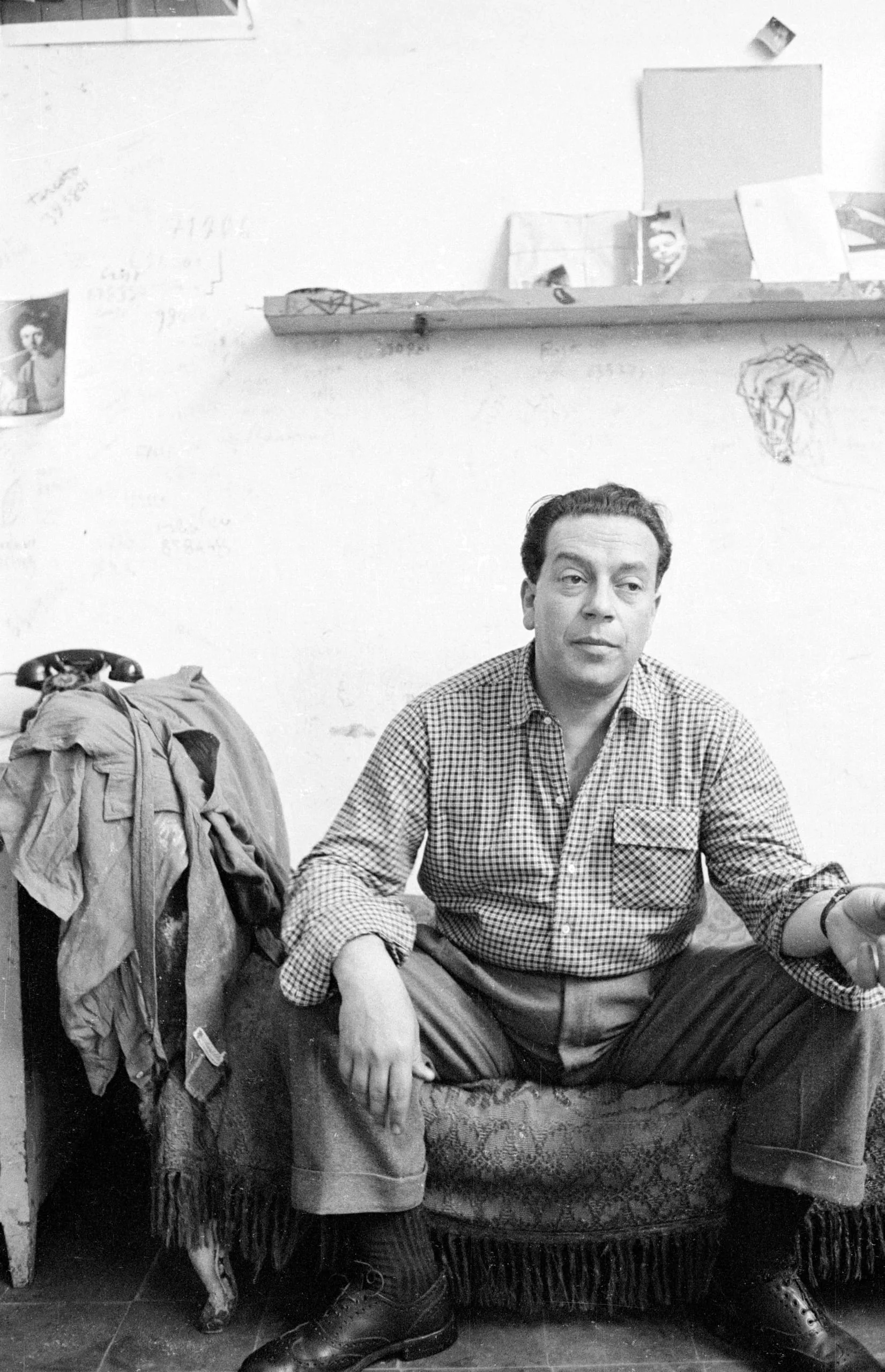 Black and white photograph of a dark-haired man in a plaid shirt seated on a fringed bench, facing the camera, with a cluttered wall behind him