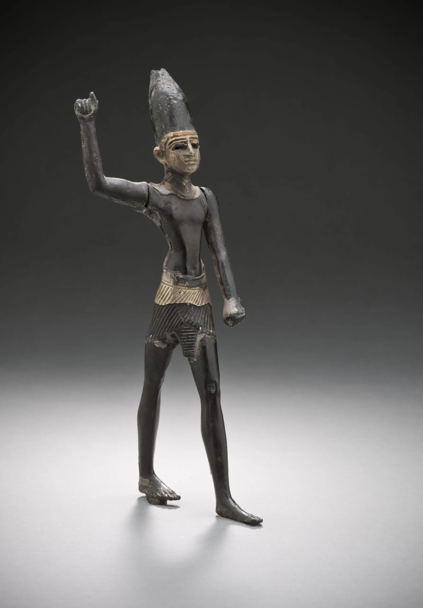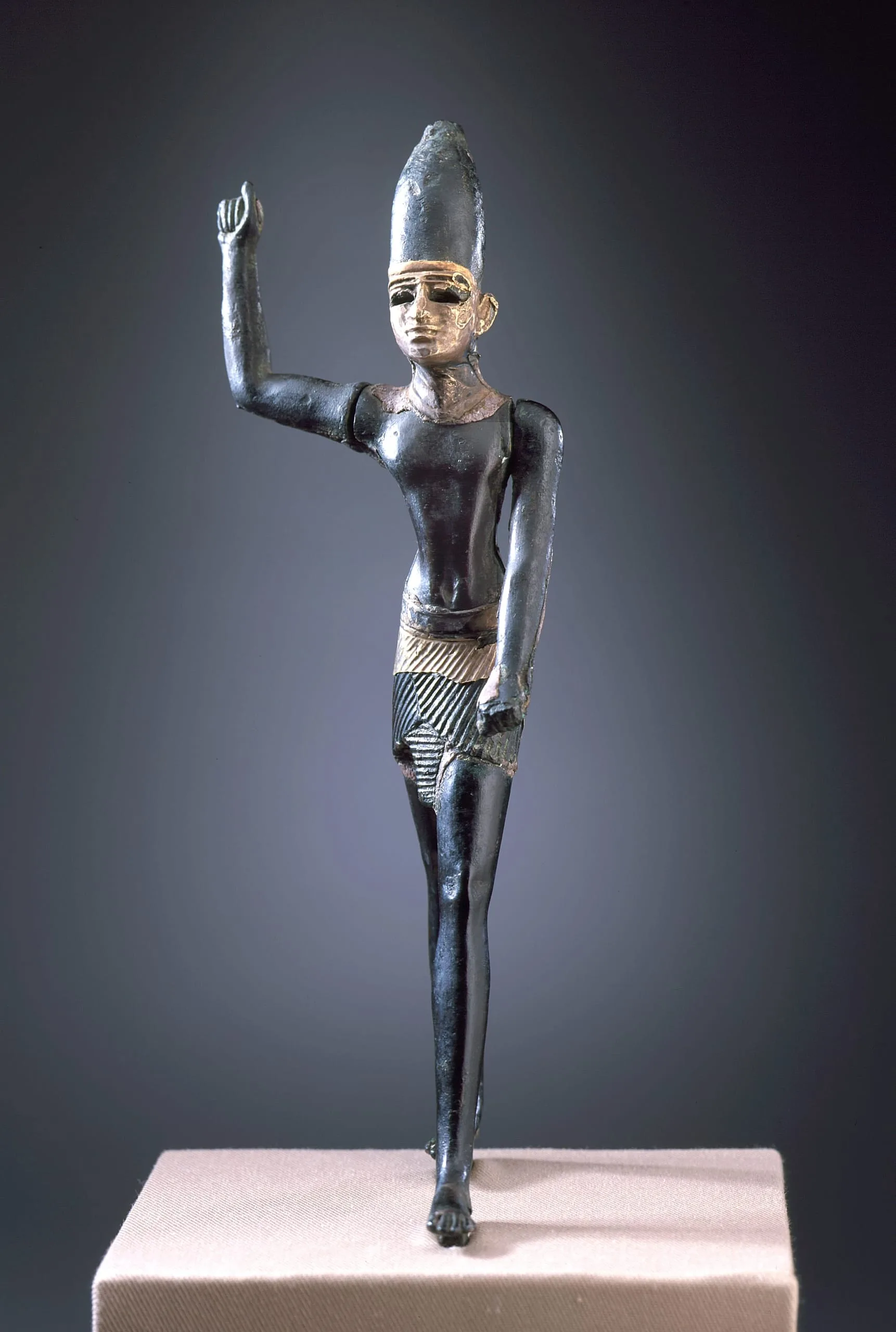In the fifteenth century BC, the Egyptians and the Mitannians of Syria controlled the small kingdom of Ugarit in northern Syria. The bronzeworkers of the Ugarit region represented divinities with Egyptianized features, a fact that can be seen in the pharaonic white crown of this warrior god. The statuette has been dated, according to similar pieces, to the fourteenth century BC, and it originally brandished a weapon, probably a spear, and a shield. The influence of Hittite art, known from the rock reliefs of the Hittite religious center of Yazilikaya (near Ankara, in Turkey), is also visible in the position of the figure's hands as well as its overall gesture.